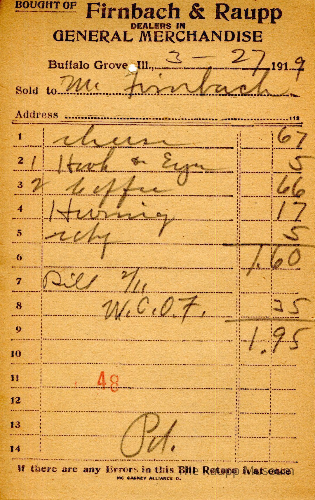 The black text is as follows, from top to bottom: Bought of Firnbach & Raupp; Dealers in GENERAL MERCHANDISE; Buffalo Grove, Ill.,; Sold to; Address; If there are any Errors in this Bill Return it at once; Mc Caskey Alliance O.Archive Details