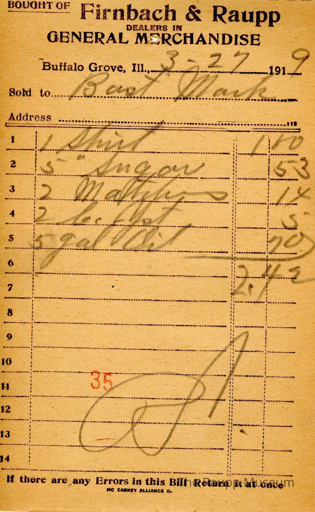 The black text is as follows, from top to bottom: Bought of Firnbach & Raupp; Dealers in GENERAL MERCHANDISE; Buffalo Grove, Ill.,; Sold to; Address; If there are any Errors in this Bill Return it at once; Mc Caskey Alliance O.Archive Details