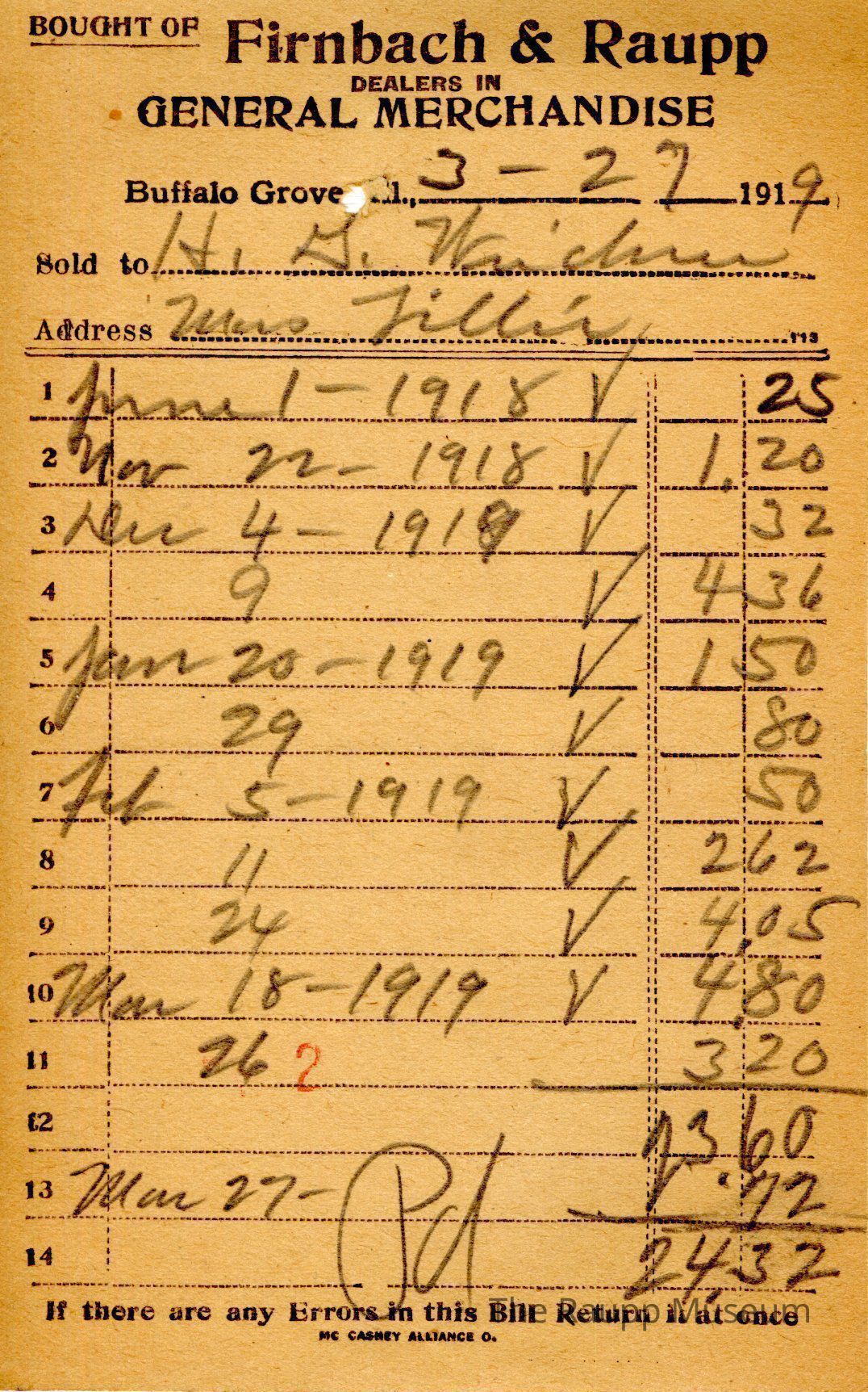 The black text is as follows, from top to bottom: Bought of Firnbach & Raupp; Dealers in GENERAL MERCHANDISE; Buffalo Grove, Ill.,; Sold to; Address; If there are any Errors in this Bill Return it at once; Mc Caskey Alliance O.Archive Details