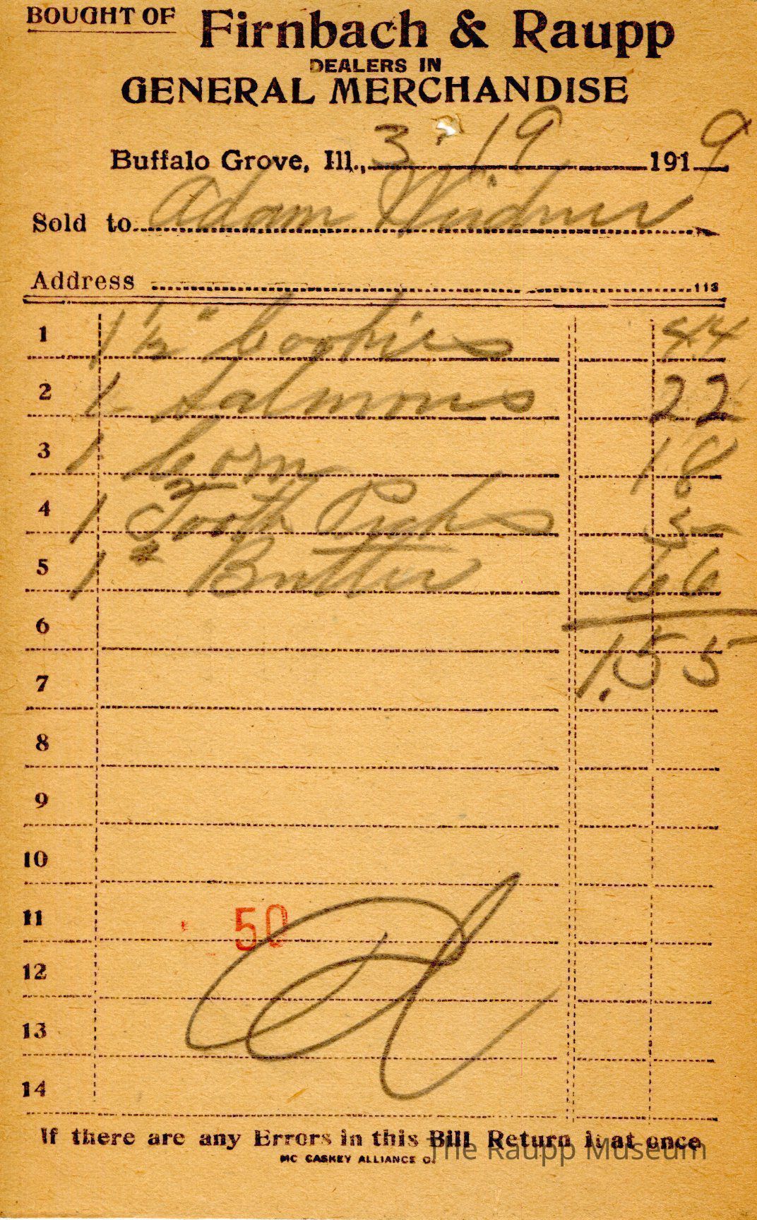 One (1) Firnbach and Raupp store receipt from March 19, 1919. Receipt is rectangular with black printed text and written notes in pencil. The receipt is for Adam Weidner, who bought 1 1/2 pounds of cookies for $0.44, 1 salmons for $0.22, 1 corn for $0.18, 1 tooth picks for $0.05, 1 pound of butter for $0.66. Bill total was $1.55. The bill is marked as paid. There is a red "50"in the bottom center.
