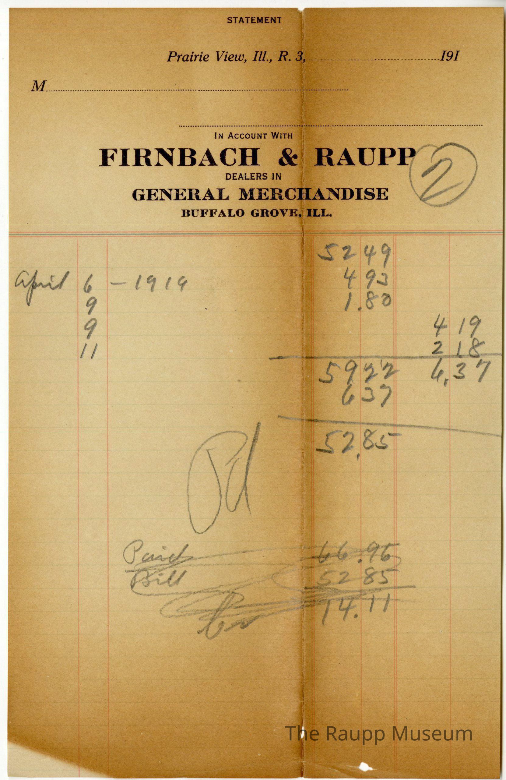 The black text is as follows, from top to bottom: "STATEMENT; Praire view, Ill., R.3,; IN ACCOUNT WITH FIRNBACH AND RAUPP DEALERS IN GENERAL MERCHANDISE BUFFALO GROVE, ILL."Archive Details