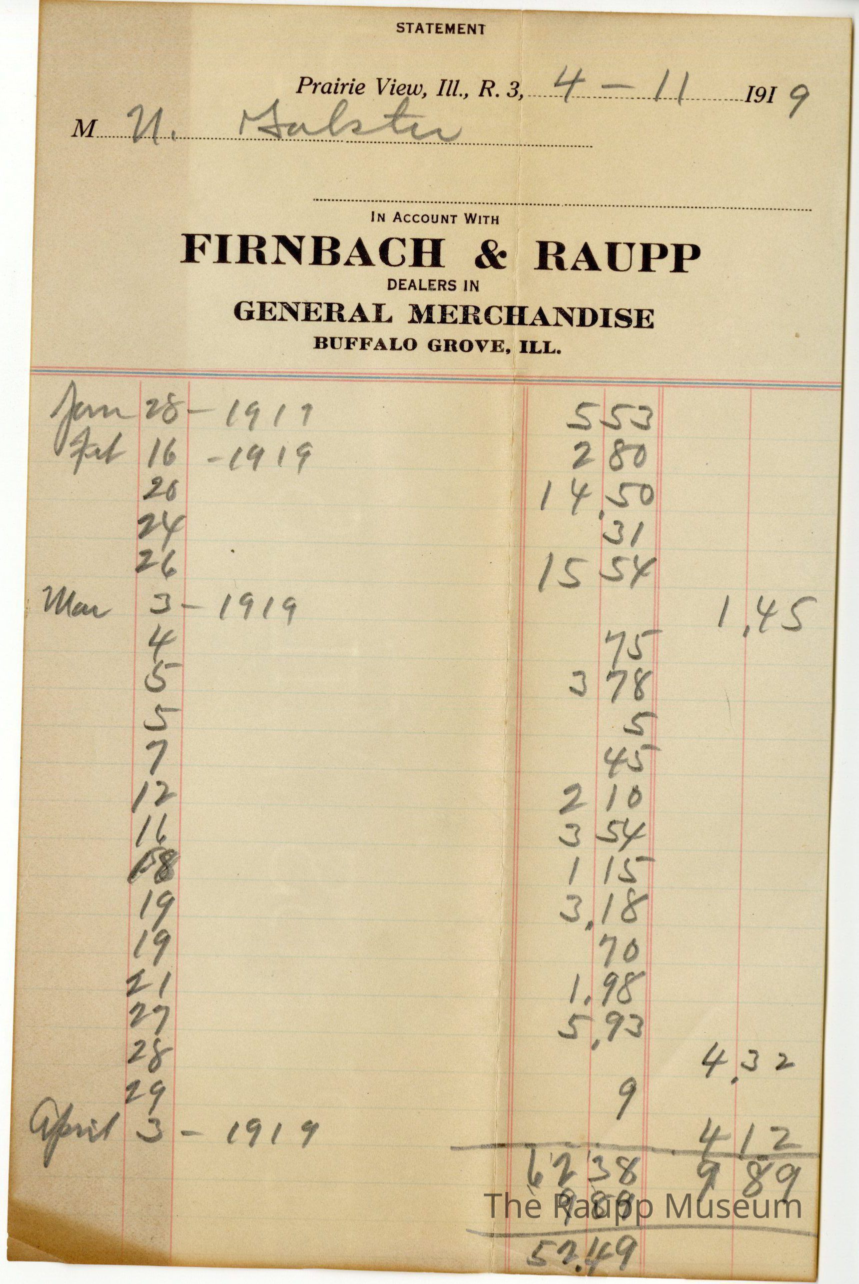 The black text is as follows, from top to bottom: "STATEMENT; Praire view, Ill., R.3,; IN ACCOUNT WITH FIRNBACH AND RAUPP DEALERS IN GENERAL MERCHANDISE BUFFALO GROVE, ILL."Archive Details