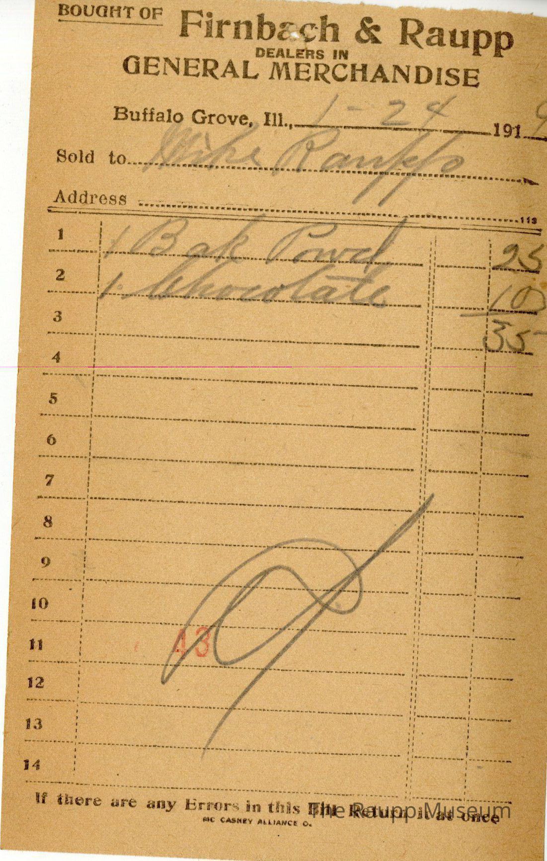 One (1) Firnbach and Raupp store receipt from January 24th, 1919. Receipt is rectangular with black printed text and handwritten notes in pencil. The receipt is for Michael Raupp who bought 1 Baking Powder for $0.25, and 1 chocolate for $0.10. Bill total was $0.35 and is marked as paid. There is a red stamp of 43 close to the bottom.