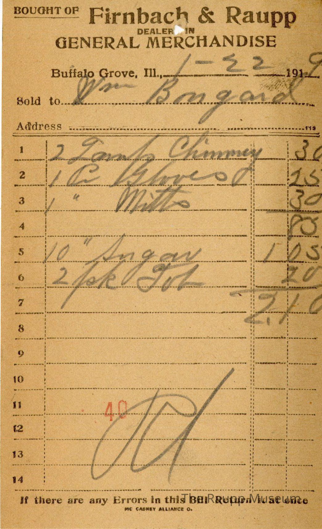 The black text is as follows, from top to bottom: "Bought of Firnbach and Raupp: Dealers in GENERAL MERCHANDISE; Buffalo Grove , Ill.; Sold to; Address; If there are any Errors in this Bill Return it at once; MC CASKEY ALLIANCE O."Archive Details