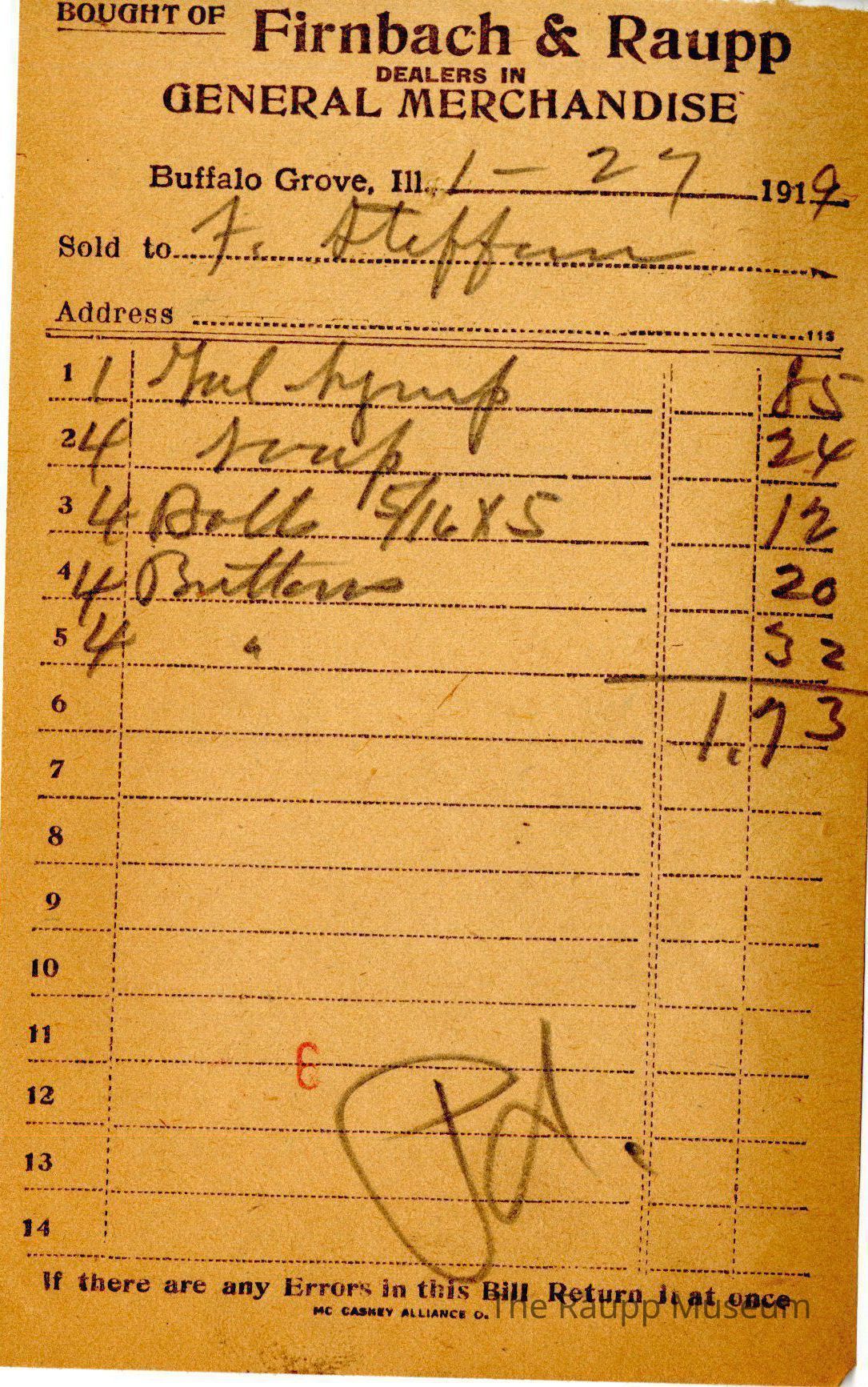 The black text is as follows, from top to bottom: "Bought of FIRNBACH & RAUPP: Dealers in General Merchandise; Buffalo Grove , Ill.; Sold to; Address; If there are any Errors in this Bill, Return it at once; MC CASKEY ALLIANCE O;."Archive Details