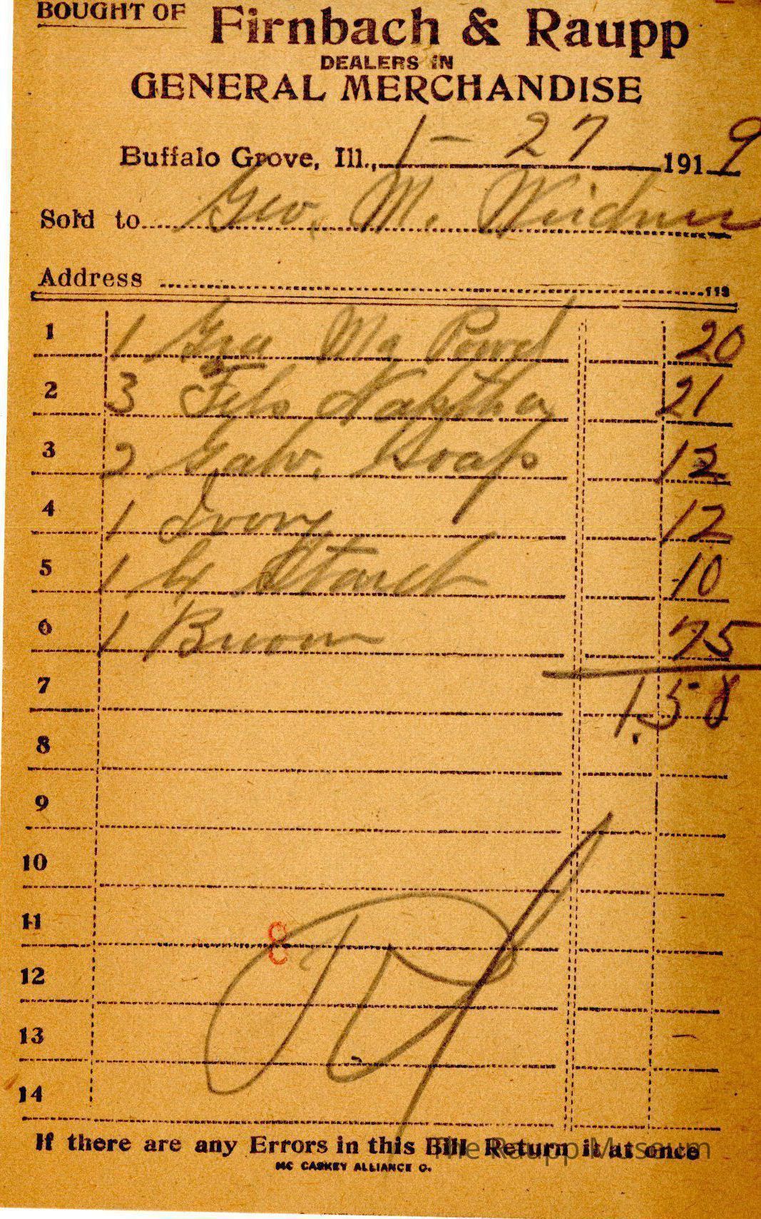 The black text is as follows, from top to bottom: "Bought of FIRNBACH & RAUPP: Dealers in General Merchandise; Buffalo Grove , Ill.; Sold to; Address; If there are any Errors in this Bill, Return it at once; MC CASKEY ALLIANCE O;."Archive Details