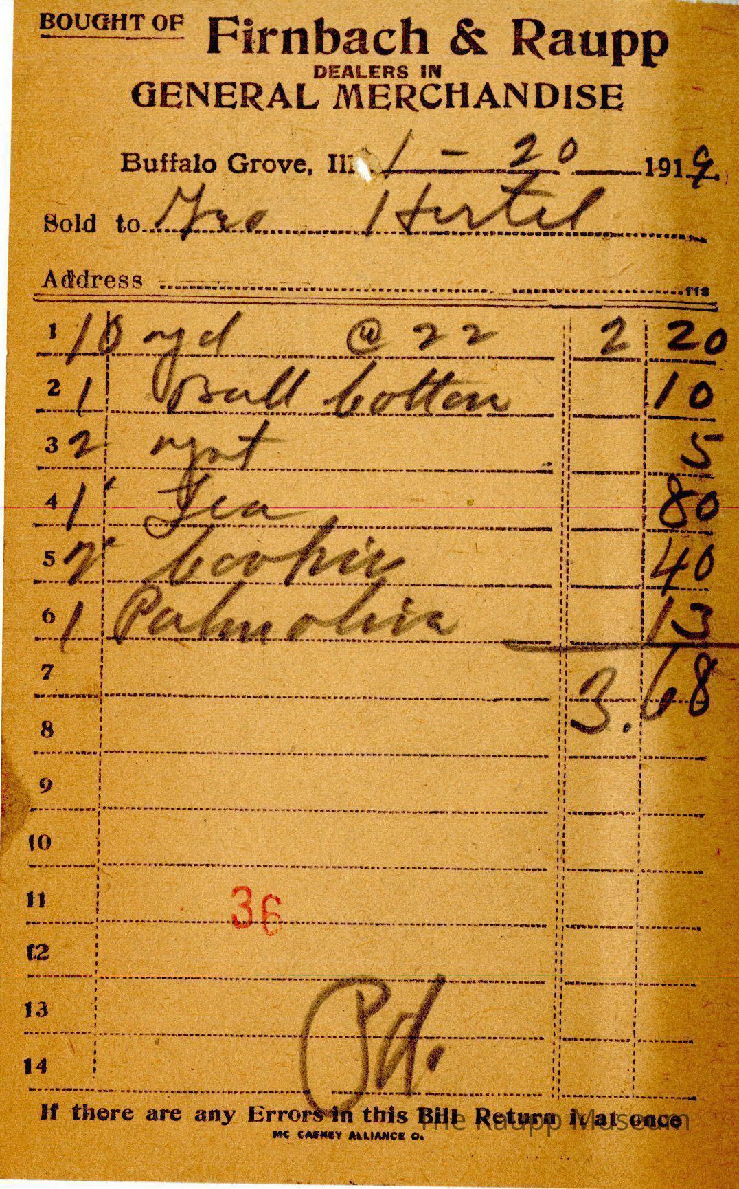 One (1) Firnbach and Raupp store receipt from January 20th, 1919. Receipt is rectangular with black printed text and handwritten notes in pencil. The receipt is for Mr. Hertel, who bought 10 yd @22 for $2.20, 1 ball button for $0.10, 2 pounds of yeast for $0.05, 1 Tea for $0.80, 2 pounds of cookies for $0.40, and 1 palm olive for $0.13. Bill total is $3.68 and is marked as paid. There is a red stamp of 36 close to the bottom.