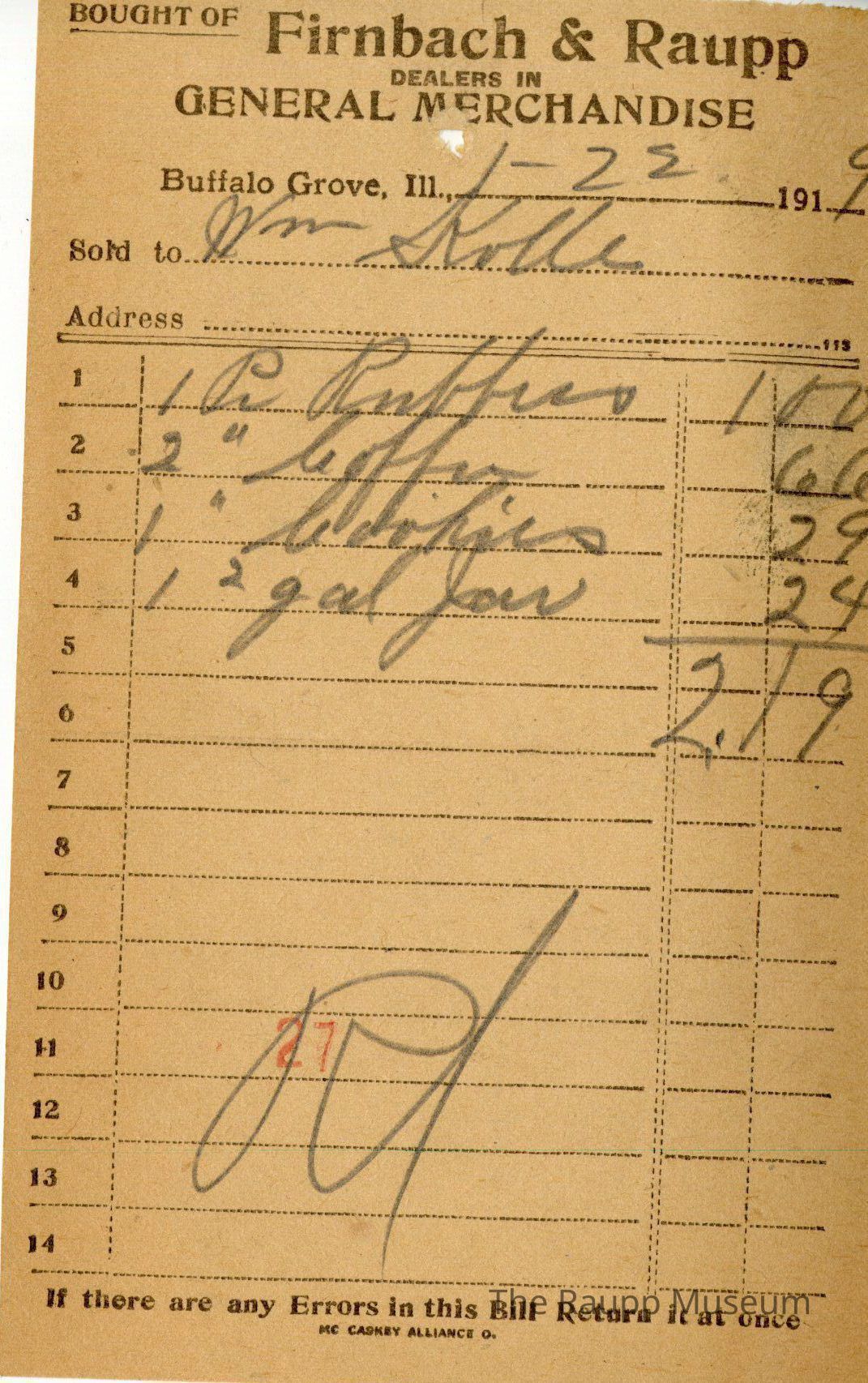 The black text is as follows, from top to bottom: "Bought of Firnbach and Raupp: Dealers in GENERAL MERCHANDISE; Buffalo Grove , Ill.; Sold to; Address; If there are any Errors in this Bill Return it at once; MC CASKEY ALLIANCE O."Archive Details