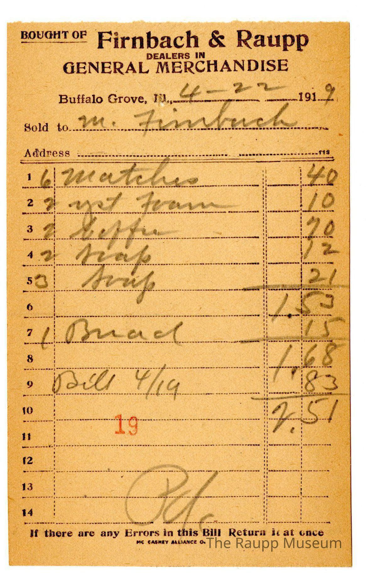 The black text is as follows, from top to bottom: "Bought of Firnbach and Raupp: Dealers in GENERAL MERCHANDISE; Buffalo Grove , Ill.; Sold to; Address; If there are any Errors in this Bill Return it at once; MC CARNEY ALLIANCE O."Archive Details