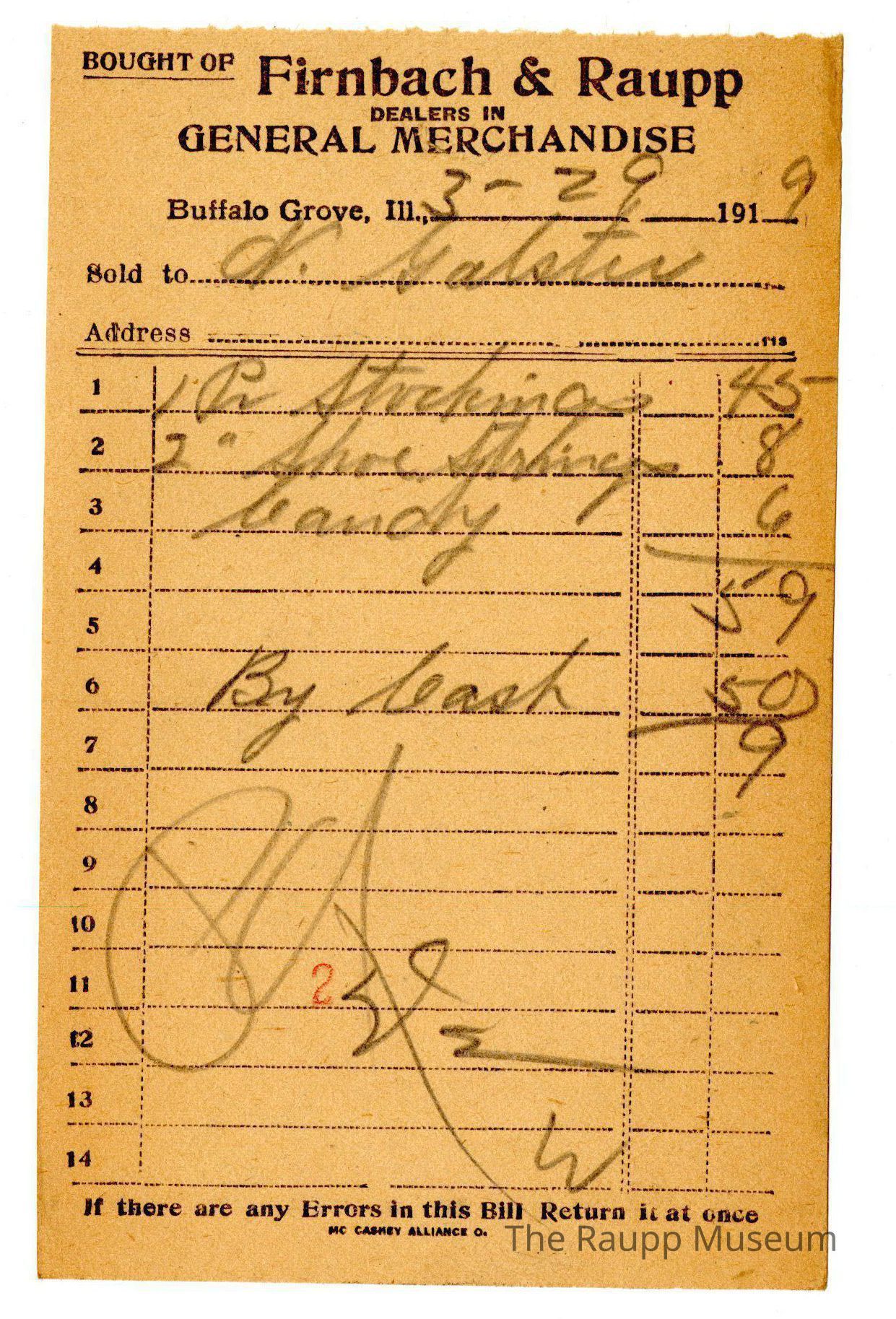One (1) Firnbach and Raupp store receipt from March 29, 1919. Receipt is rectangular with black printed text and handwritten notes in pencil. The receipt is for N. Galster who bought 1 pair stockings for $0.45, 2 shoe shinings for $0.08, candy for $0.06. Bill total was $0.59, and $0.50 was paid by cash leaving $0.09. Bill is marked as paid. There is a red stamp of 2 close to the bottom.
