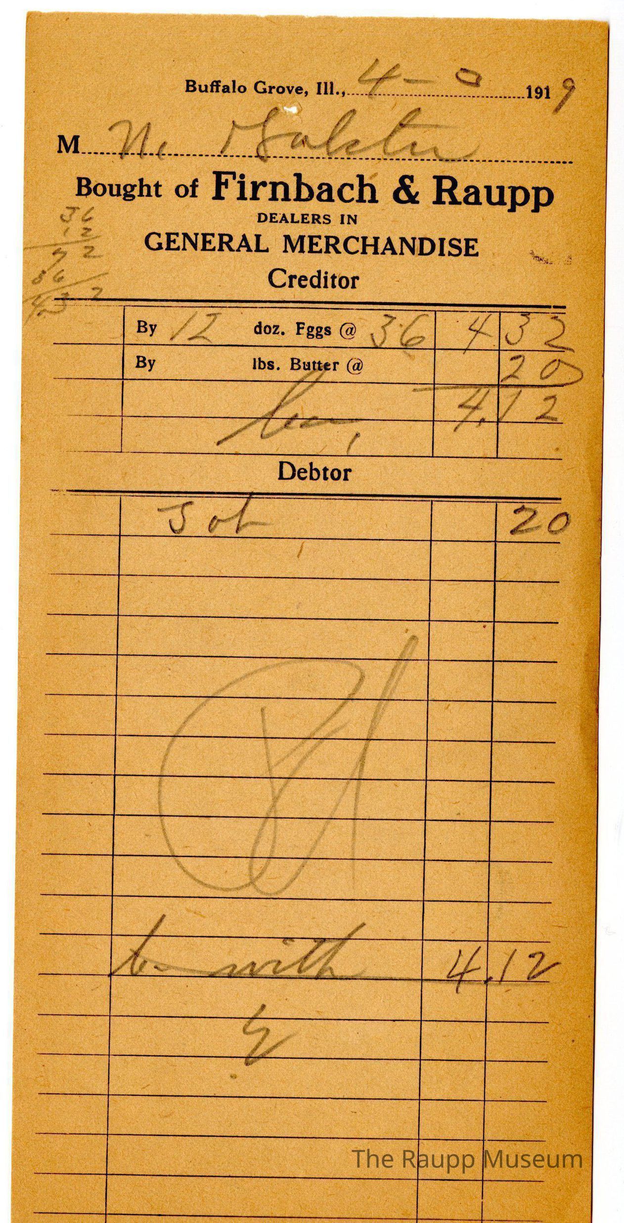 The black text is as follows, from top to bottom: Buffalo Grove, Ill. ; Bought of Firnbach and Raupp: Dealers in GENERAL MERCHANDISE; Creditor; By, doz. Eggs @; By, lbs. Butter @; Debtor"Archive Details