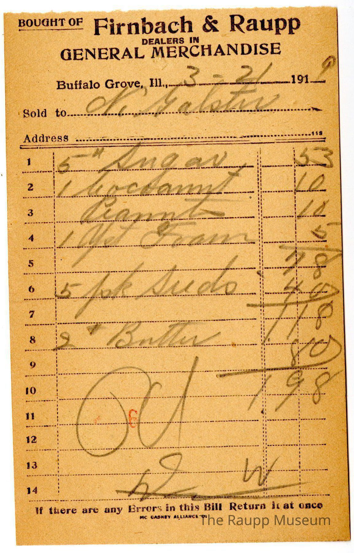 The black text is as follows, from top to bottom: "Bought of Firnbach and Raupp: Dealers in GENERAL MERCHANDISE; Buffalo Grove , Ill.; Sold to; Address; If there are any Errors in this Bill Return it at once; MC CARNEY ALLIANCE O."Archive Details
