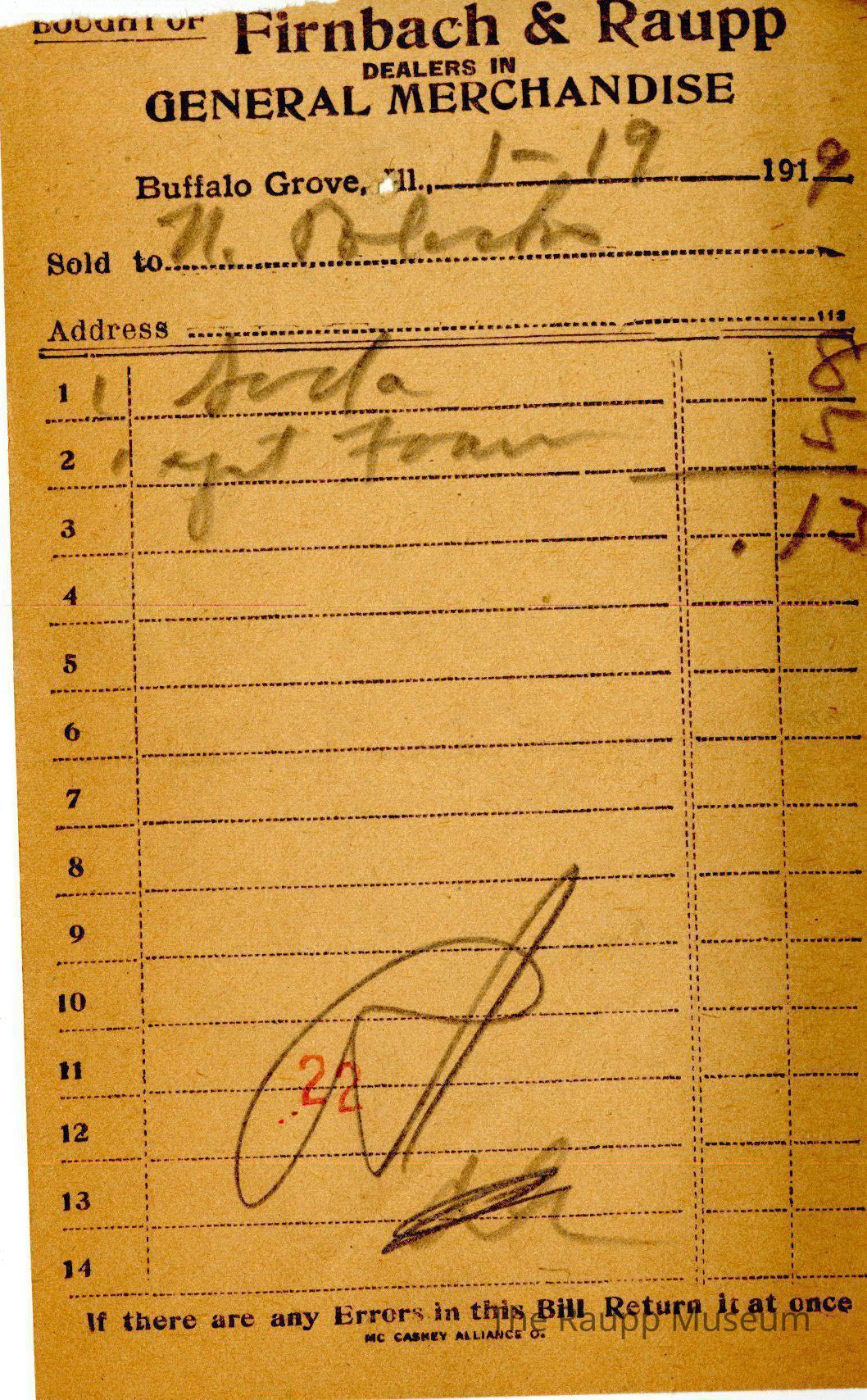 The black text is as follows, from top to bottom: "Bought of Firnbach and Raupp: Dealers in GENERAL MERCHANDISE; Buffalo Grove , Ill.; Sold to; Address; If there are any Errors in this Bill Return it at once; MC CASKEY ALLIANCE O."Archive Details
