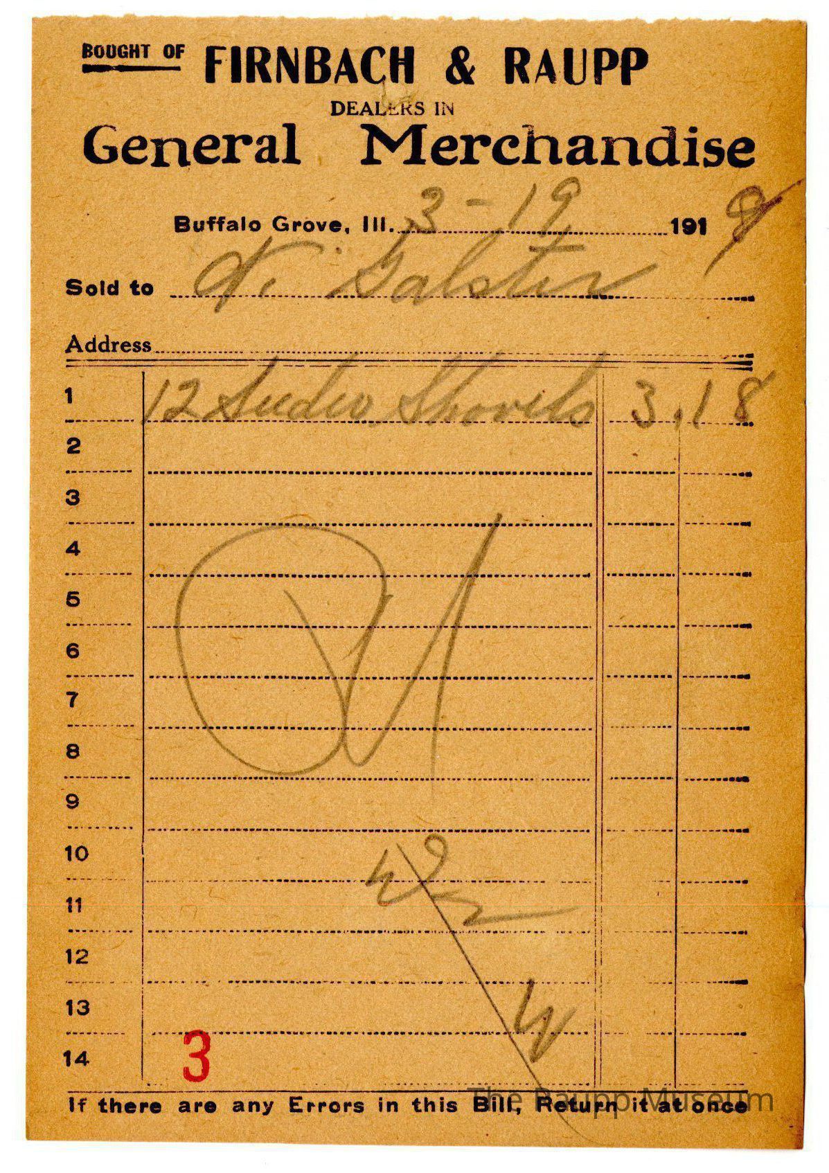 The black text is as follows, from top to bottom: "Bought of FIRNBACH AND RAUPP: Dealers in General Merchandise; Buffalo Grove , Ill.; Sold to; Address; If there are any Errors in this Bill, Return it at once."Archive Details