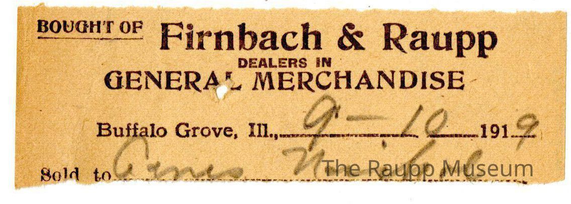 The black text is as follows, from top to bottom: Bought of Firnbach & Raupp; Dealers in GENERAL MERCHANDISE; Buffalo Grove, Ill.: Sold to.Archive Details