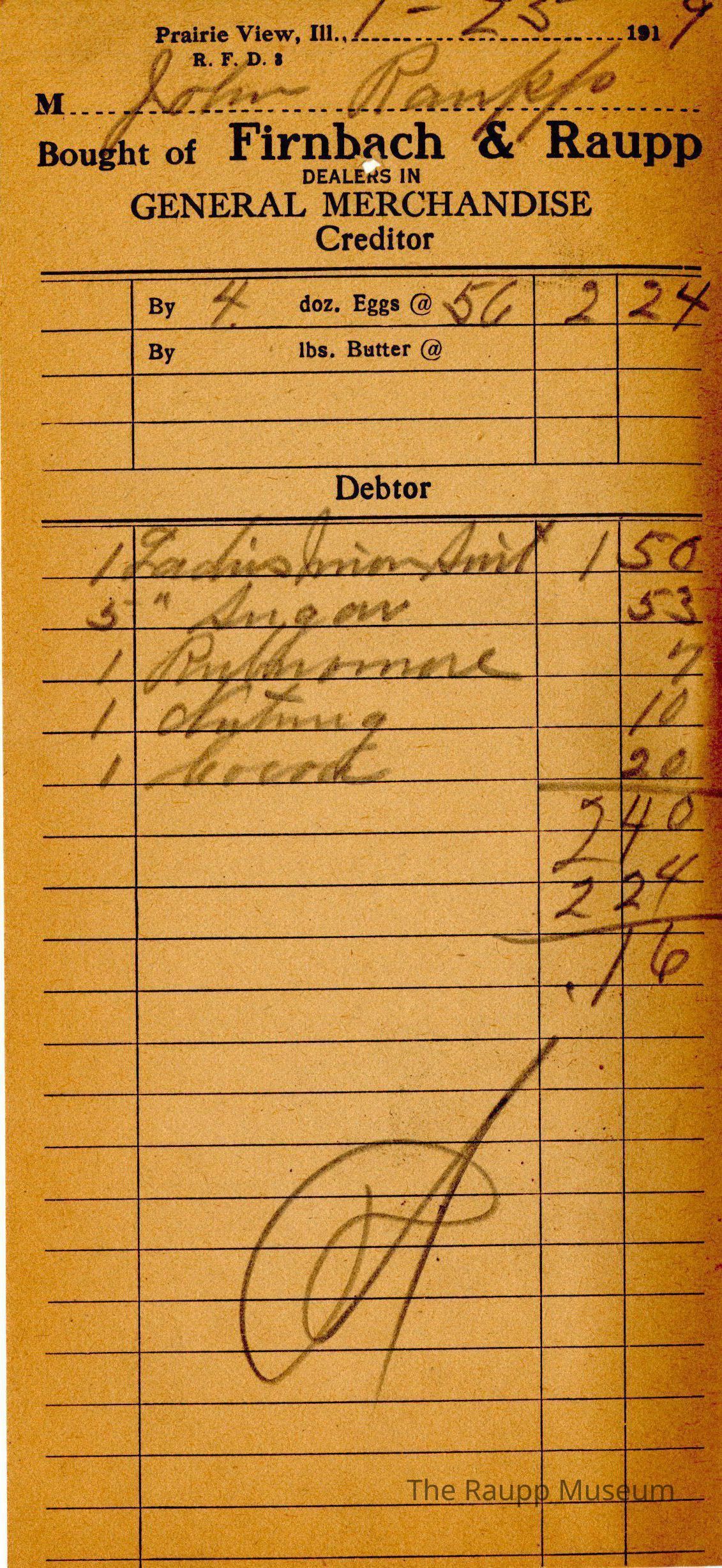 One (1) Firnbach and Raupp store receipt from January 25th,1919. Receipt is rectangular with black printed text and handwritten notes in pencil. Receipt is for John Raupp who sold 4 dozens of eggs at $0.56 each, total being $2.24. He bought 1 ladies swim suit for $1.50, 5 pounds of sugar for $0.53, 1 Rubnomore for $0.07, 1 pound of nutmeg for $0.10, 1 cocoa for $0.20. The bill total was $0.16. They paid $0.16 by cash. The bill was marked as paid.