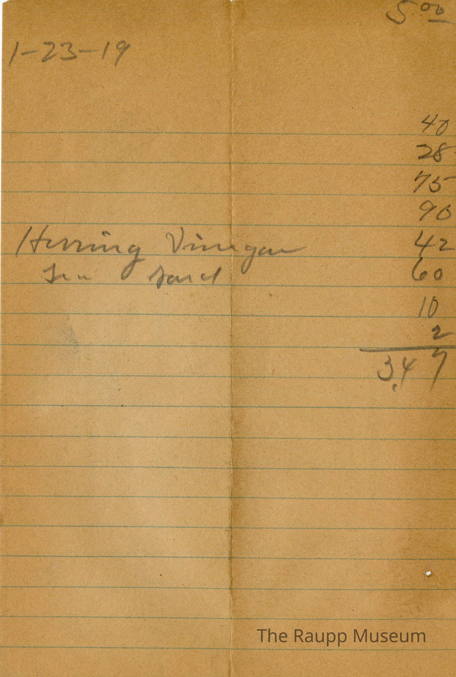 One (1) Firnbach and Raupp store receipt from January 23rd, 1919. Receipt is rectangular with no printed text and written notes in pencil. The receipt is for an unknown customer, who bought Herring, Vinegar, Tea(?) and Sard(?). The bill total appears to be $3.47. There are also several random prices seen on the right side of the receipt.