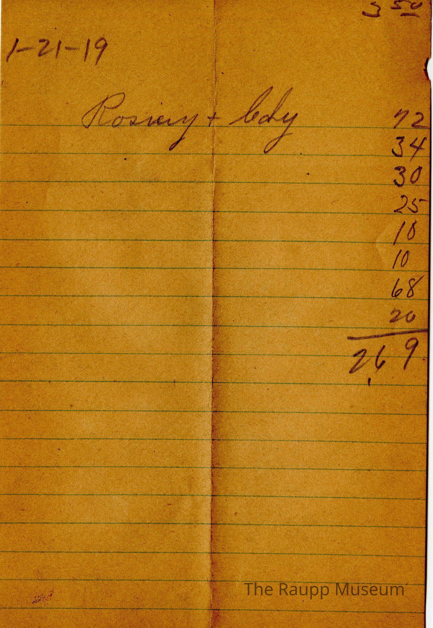 One (1) Firnbach and Raupp store receipt from January 21st, 1919. Receipt is rectangular with no printed text and written notes in pencil. The receipt is for an unknown customer, who bought Rosemary(?) + Candy. The bill total appears to be $2.69. There are also several random prices seen on the right side of the receipt.