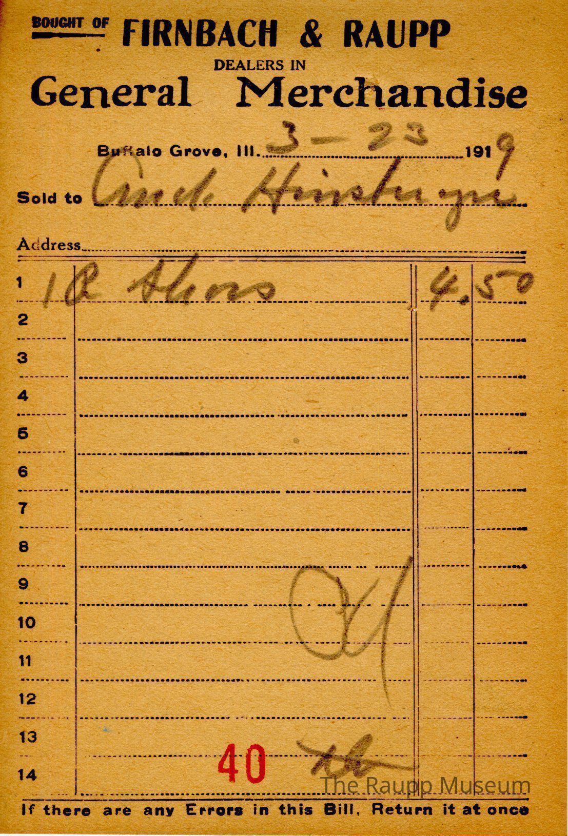 One (1) Firnbach and Raupp store receipt from March 23, 1919. Receipt is rectangular with black printed text and written notes in pencil. The receipt is for Andrew Hinsberger, who bought 1 pair of shoes for $4.50. The bill is marked as paid. There is a red "40" and writing near the bottom.