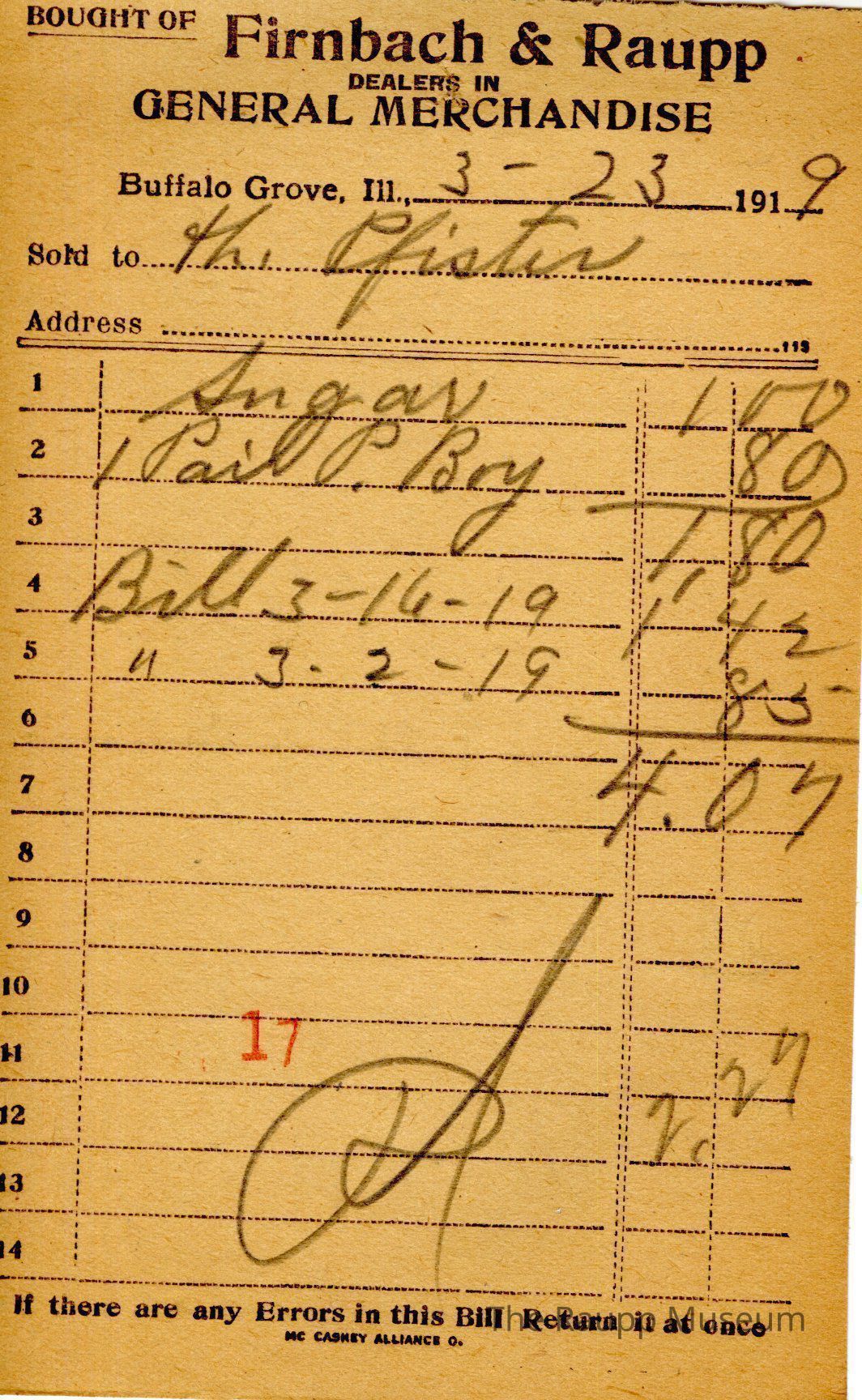 The black text is as follows, from top to bottom: Bought of Firnbach & Raupp; Dealers in GENERAL MERCHANDISE; Buffalo Grove, Ill.,; Sold to; Address; If there are any Errors in this Bill Return it at once; Mc Caskey Alliance O.Archive Details