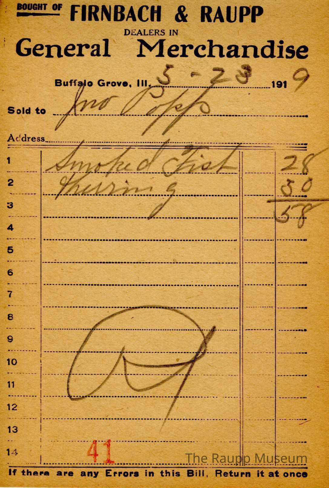 The black text is as follows, from top to bottom: Bought of Firnbach & Raupp; Dealers in GENERAL MERCHANDISE; Buffalo Grove, Ill.,; Sold to; Address; If there are any Errors in this Bill Return it at once; Mc Caskey Alliance O.Archive Details