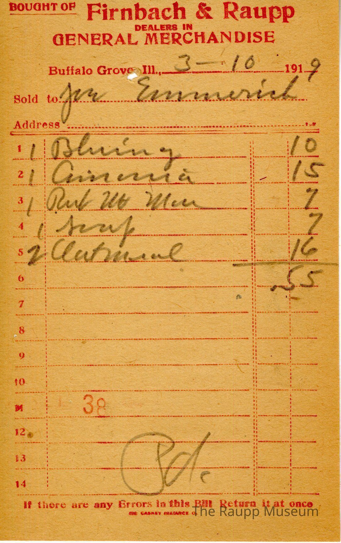 One (1) Firnbach and Raupp store receipt from March 10, 1919. Receipt is rectangular with red printed text and written notes in pencil. The receipt is for Joe Emmerich, who bought 1 Bluing for $0.10, 1 for $0.15, 1 Rub No More for $0.07, and 2 oatmeal for $0.16. Bill total is $0.55. The bill is marked as paid. There is a red "38" near the bottom.