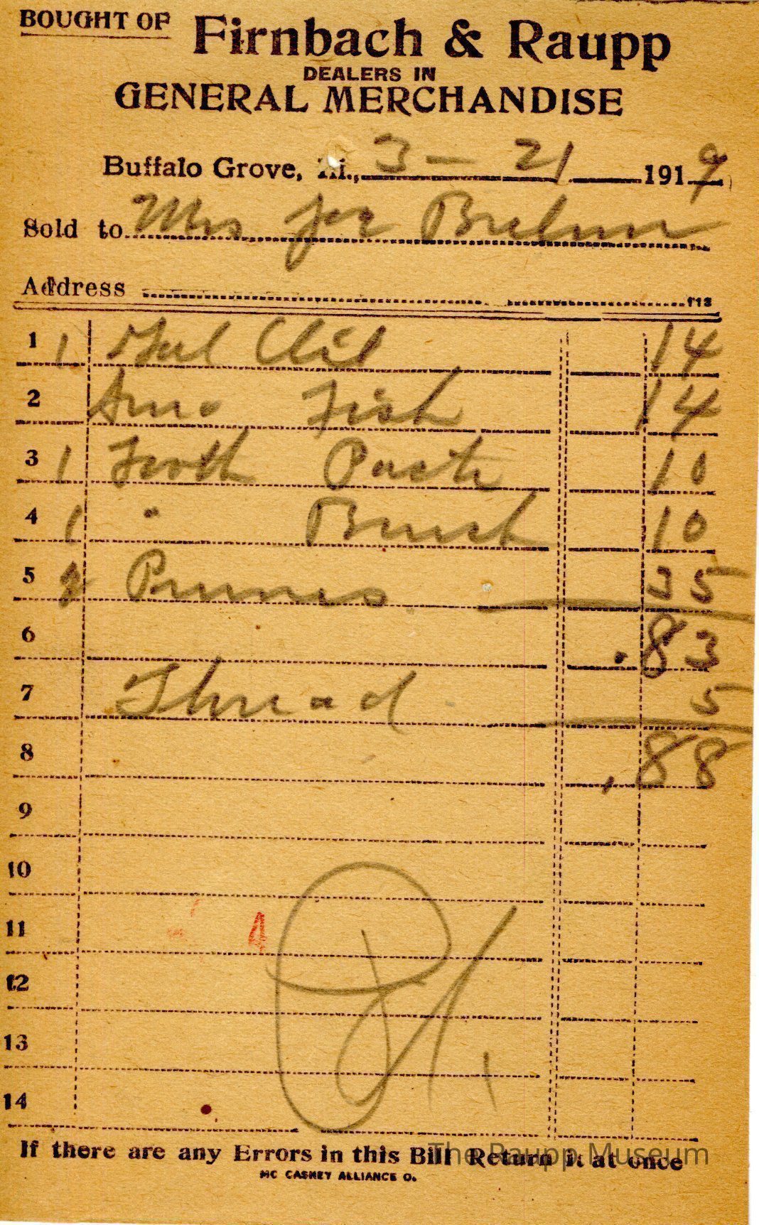 The black text is as follows, from top to bottom: Bought of Firnbach & Raupp; Dealers in GENERAL MERCHANDISE; Buffalo Grove, Ill.,; Sold to; Address; If there are any Errors in this Bill Return it at once; Mc Caskey Alliance O.Archive Details