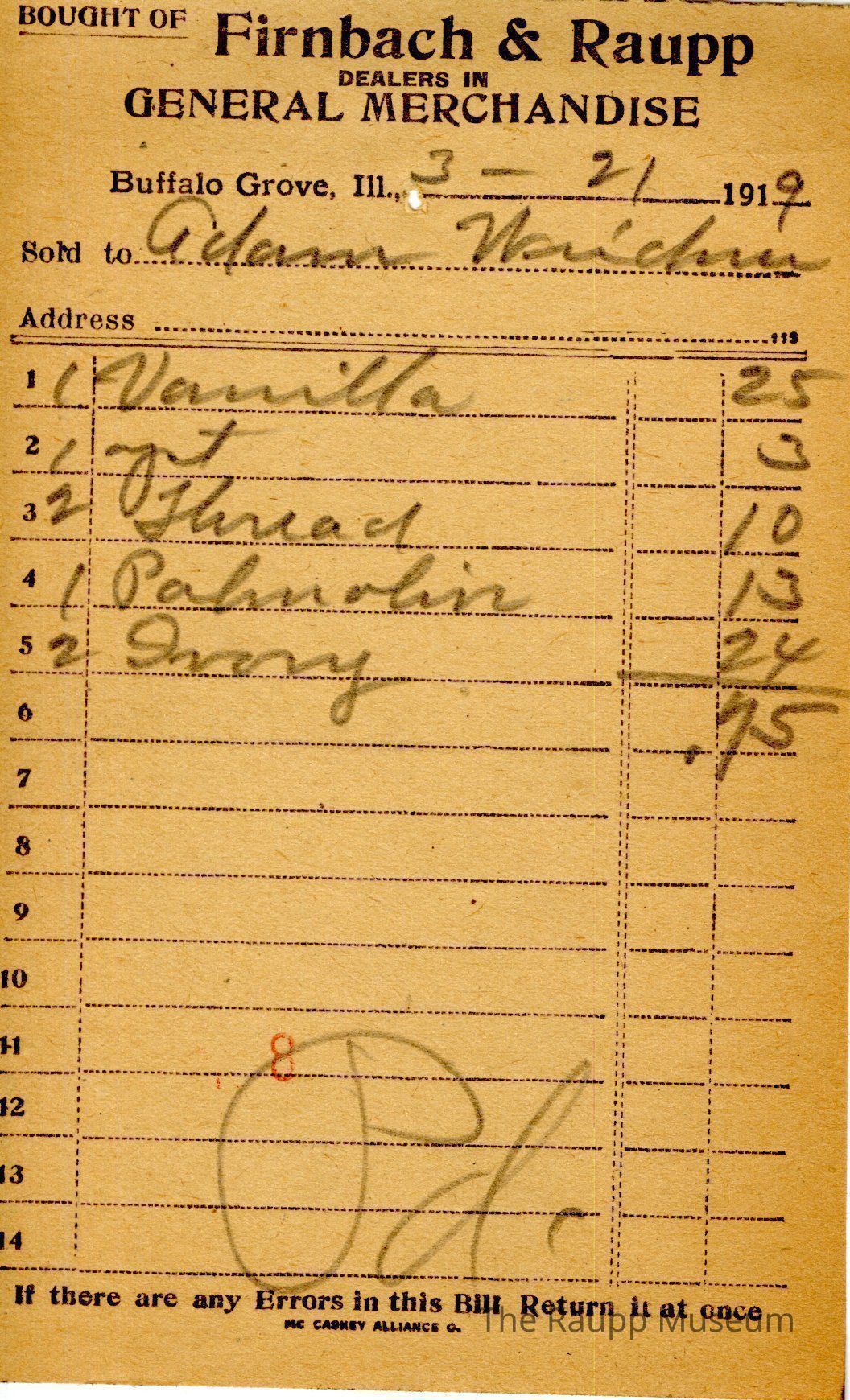 The black text is as follows, from top to bottom: Bought of Firnbach & Raupp; Dealers in GENERAL MERCHANDISE; Buffalo Grove, Ill.,; Sold to; Address; If there are any Errors in this Bill Return it at once; Mc Caskey Alliance O.Archive Details