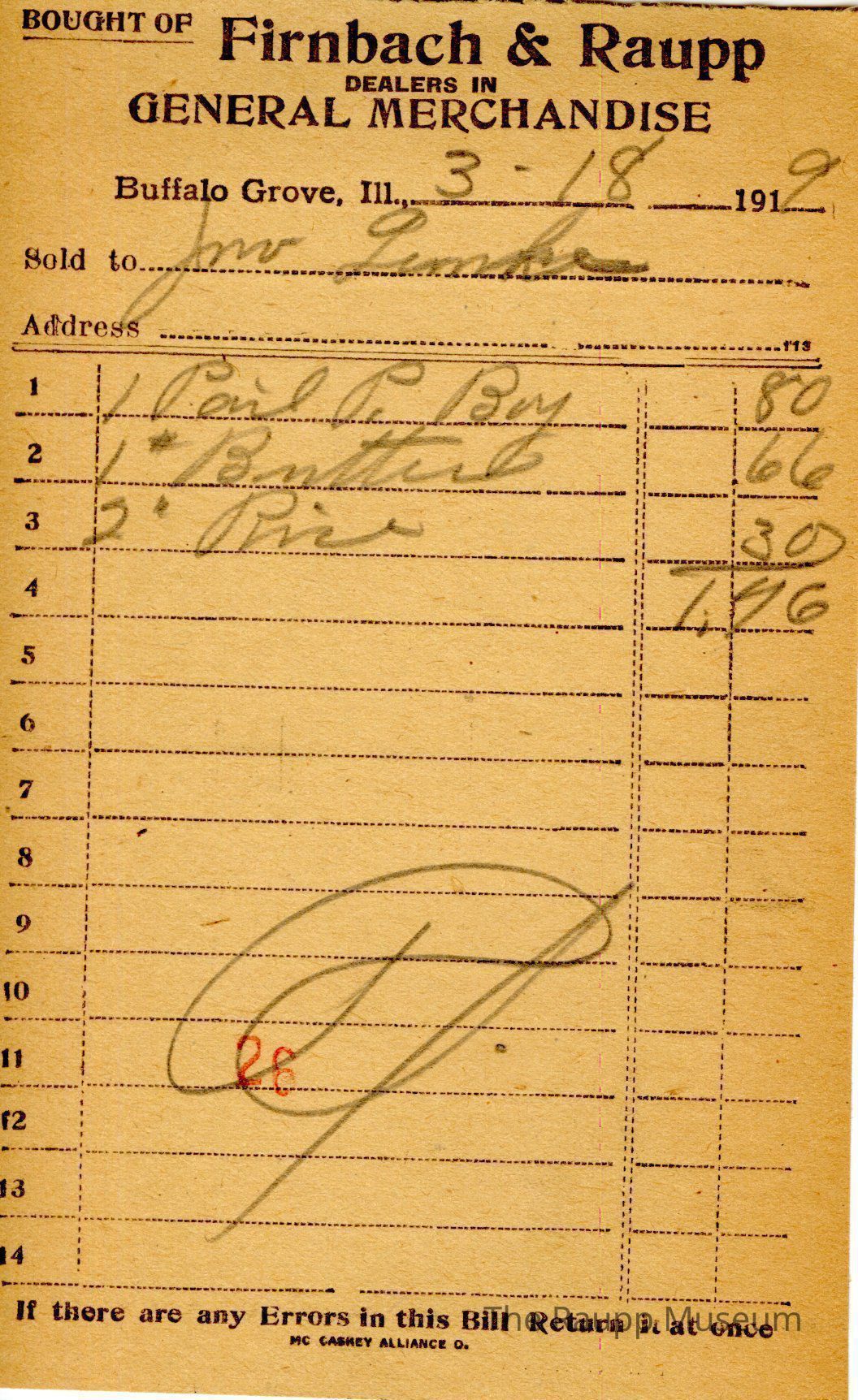 The black text is as follows, from top to bottom: Bought of Firnbach & Raupp; Dealers in GENERAL MERCHANDISE; Buffalo Grove, Ill.,; Sold to; Address; If there are any Errors in this Bill Return it at once; Mc Caskey Alliance O.Archive Details
