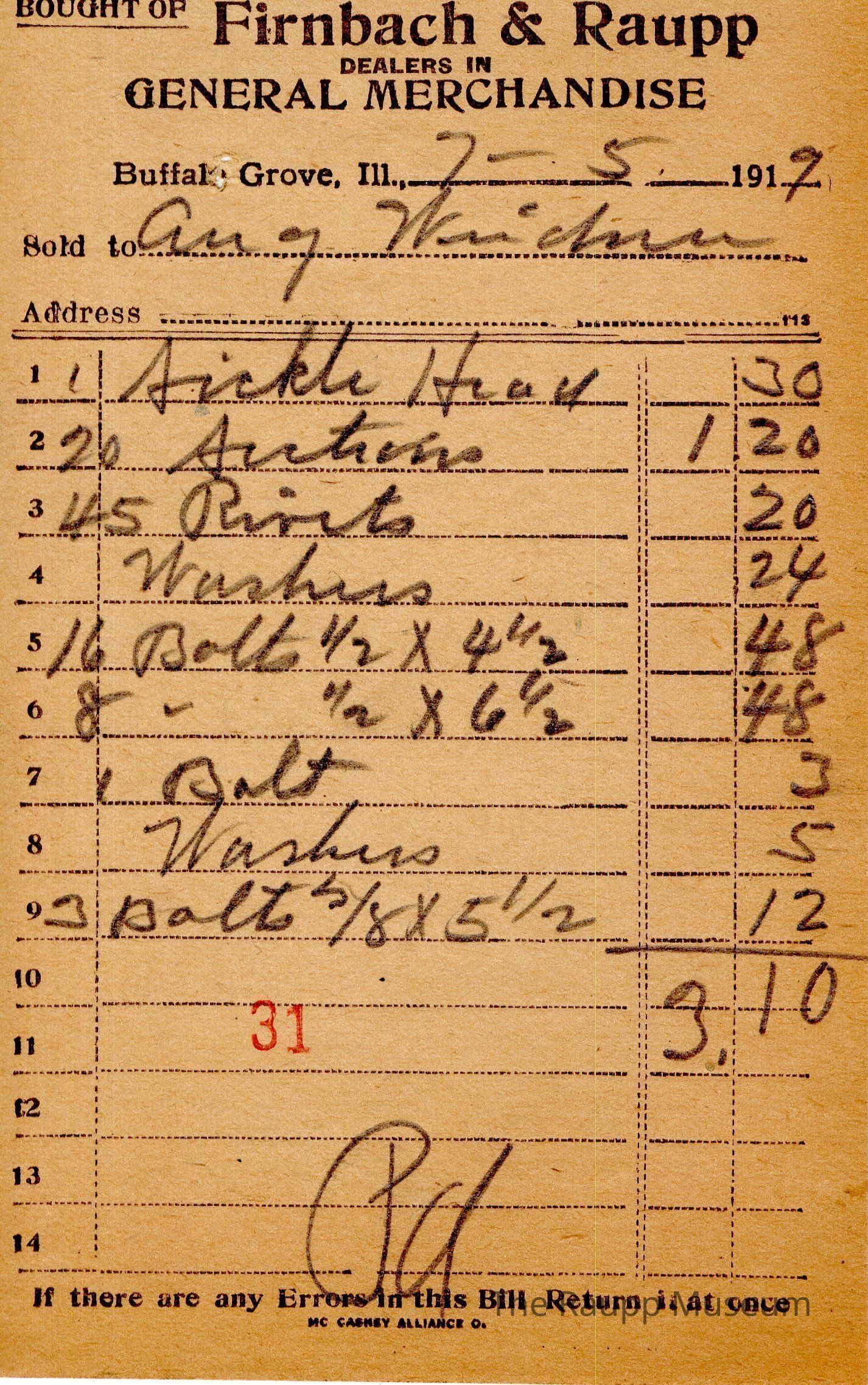 One (1) Firnbach and Raupp receipt from July 5, 1919. Receipt is rectangular with black printed text and written notes in pencil. This receipt is for Greg Weidner who bought one sickle head for $0.30, twenty sections(?) for $1.20, forty-five rivets for $0.20, washers for $0.24, sixteen bolts for $0.48, eight bolts for $0.48, one bolt for $0.03, washers for $0.05, and three bolts for $0.12. There's a red stamp of 31 close to the bottom, with the bill marked as paid. Bill total is $3.10