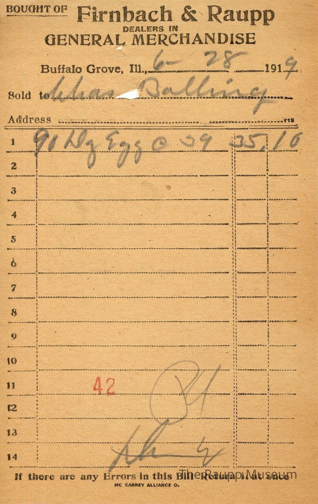 The black text is as follows, from top to bottom bought of Firnback & Raupp; Dealers in General Merchandise; Buffalo Grove, Ill.; Sold to; Address; If there are any Errors in this Bill Return it at once; MC CASKEY ALLIANCE O.Archive Details