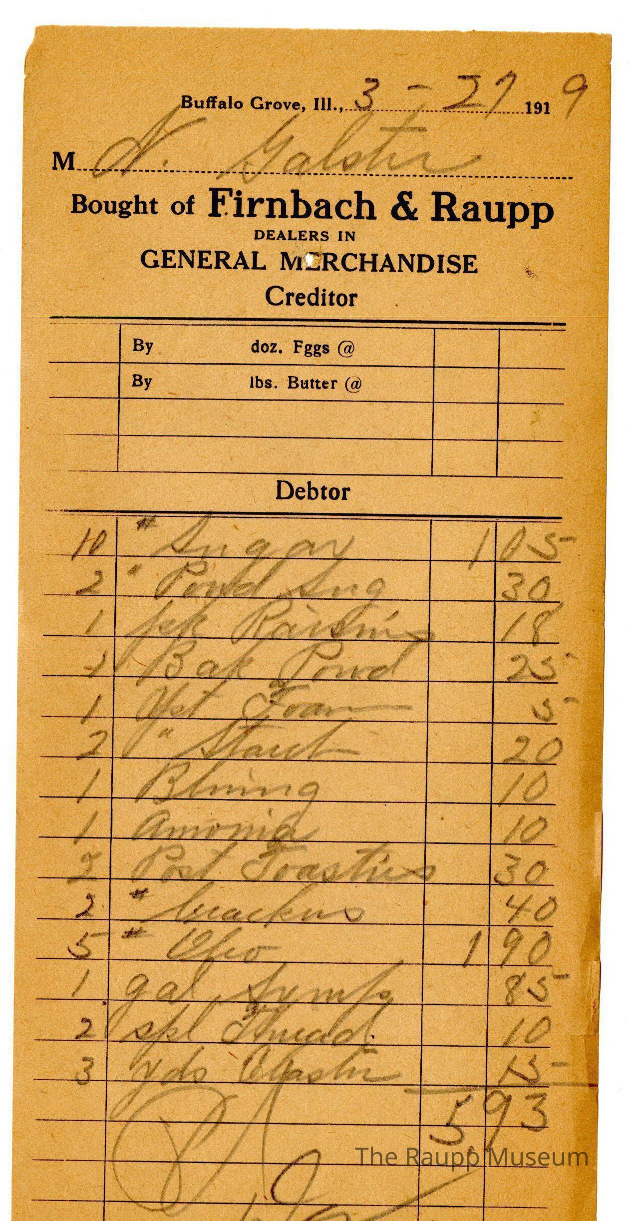 The black text is as follows, from top to bottom: Buffalo Grove, Ill. ; Bought of Firnbach and Raupp: Dealers in GENERAL MERCHANDISE; Creditor; By, doz. Eggs @; By, lbs. Butter @; Debtor"Archive Details