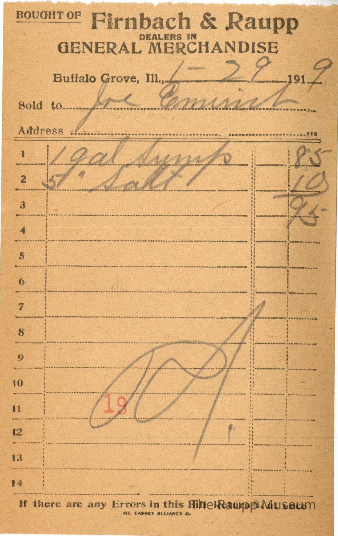 One (1) Firnbach and Raupp store receipt from January 29th, 1919. Receipt is rectangular with black printed text and handwritten notes in pencil. The receipt is for Joe Emunich(?)who bought 1 gallon of syrup for $0.85, and 5 pounds of salt for $0.10. Bill total was $0.95, and was paid by cash. The bill is marked as paid. There is a red stamp of "19" close to the bottom.