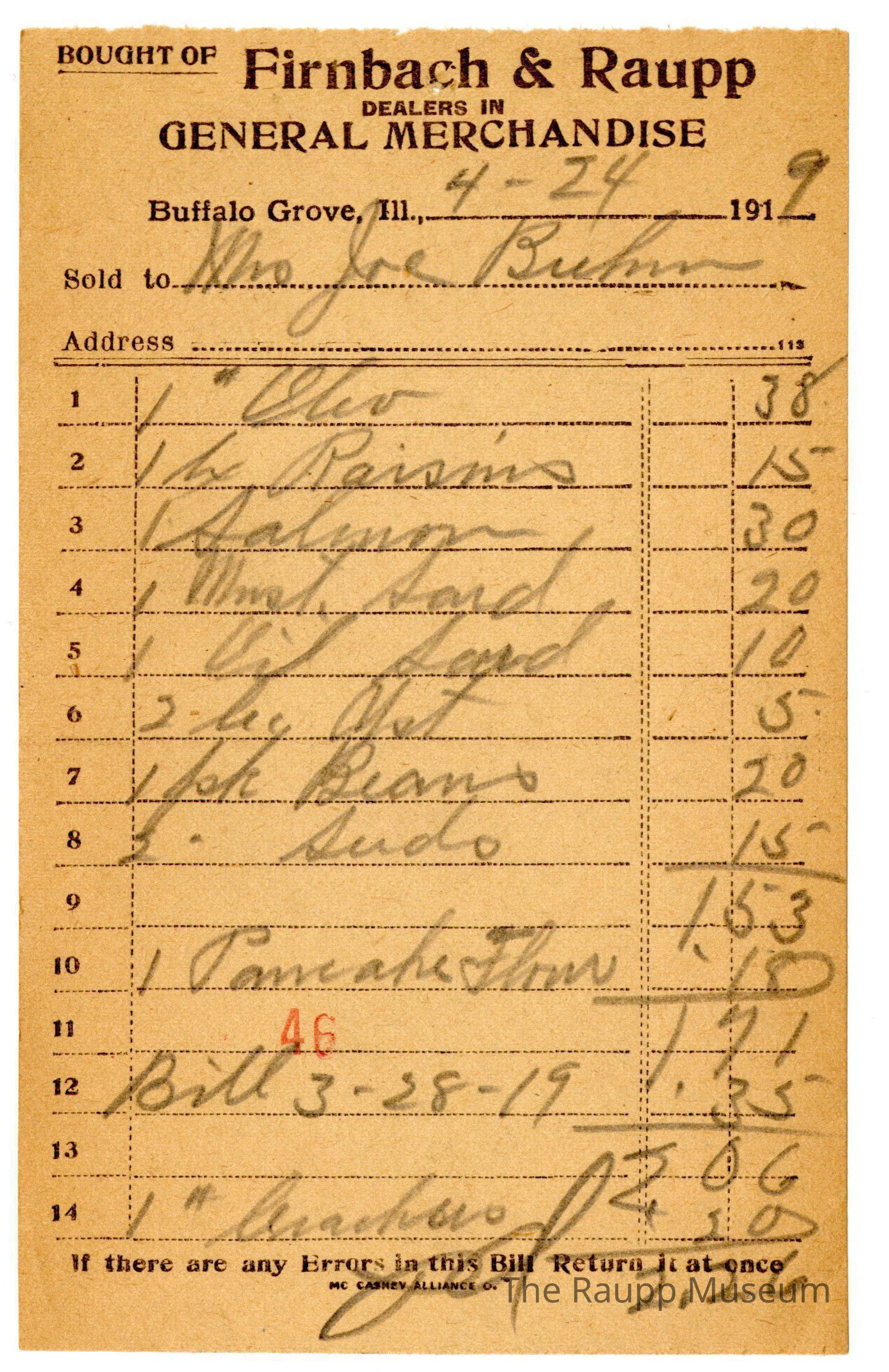 The black text is as follows, from top to bottom: "Bought of Firnbach and Raupp: Dealers in GENERAL MERCHANDISE; Buffalo Grove , Ill. ; Sold to; Address; if there are any errors in this Bill Return it at once; MC CASEY ALLIANCE O."Archive Details