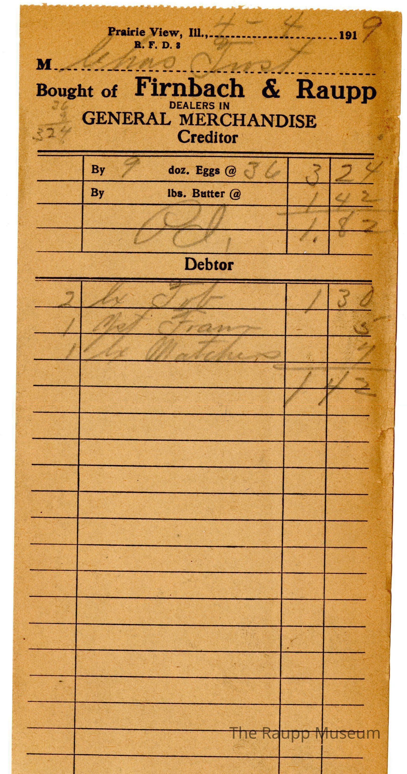 The black text is as follows, from top to bottom: Prairie View , Ill. ; Bought of Firnbach and Raupp: Dealers in GENERAL MERCHANDISE; Creditor; By, doz. Eggs @; By, lbs. Butter @; Debtor"Archive Details