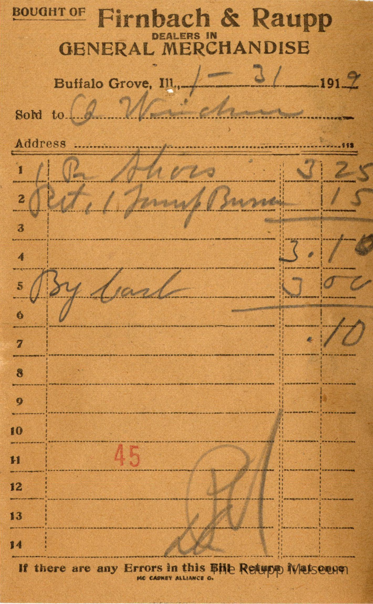 The black text is as follows, from top to bottom: "Bought of Firnbach and Raupp; Dealers in GENARL MERCHANDISE; Buffalo Grove, Il.; Sold to; Address: if there are any Errors in this Bill Return it at once ; MC CASKEY ALLIANCE O."Archive Details