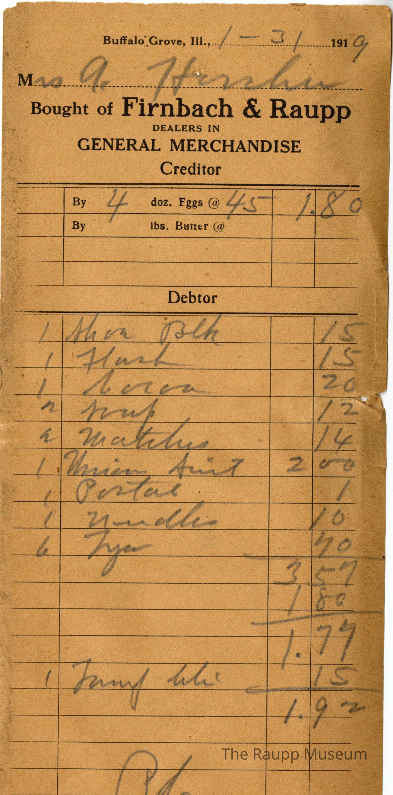 The black text is as follows, from top to bottom: "Buffalo Grove, Il.; Bought of Firnbach and Raupp; Dealers in GENARL MERCHANDISE;Creditor By dozen eggs @, By lbs butter @ , Debtor"Archive Details