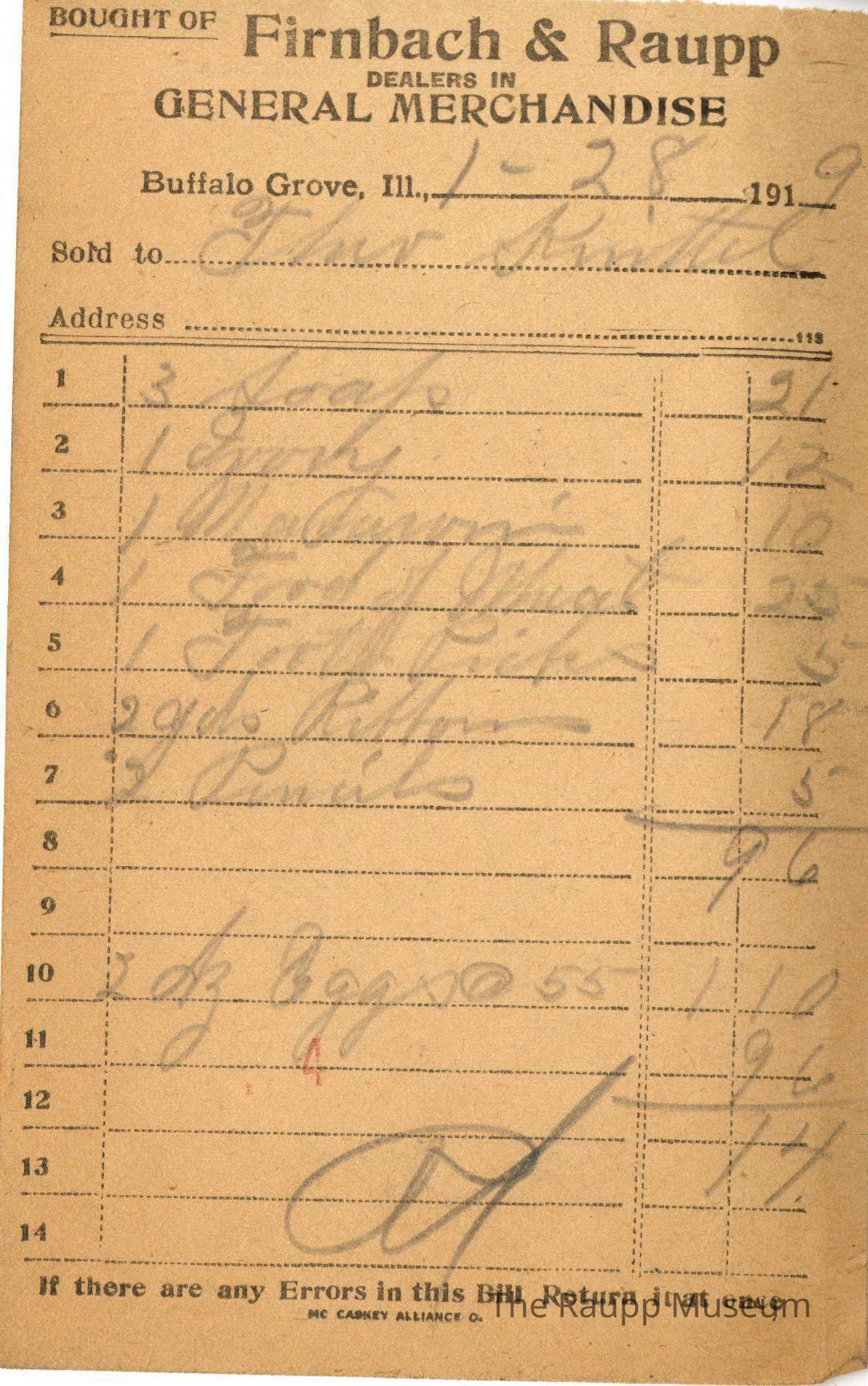 The black text is as follows, from top to bottom: "Bought of FIRNBACH & RAUPP: Dealers in General Merchandise; Buffalo Grove , Ill.; Sold to; Address; If there are any Errors in this Bill, Return it at once; MC CASKEY ALLIANCE O;."Archive Details