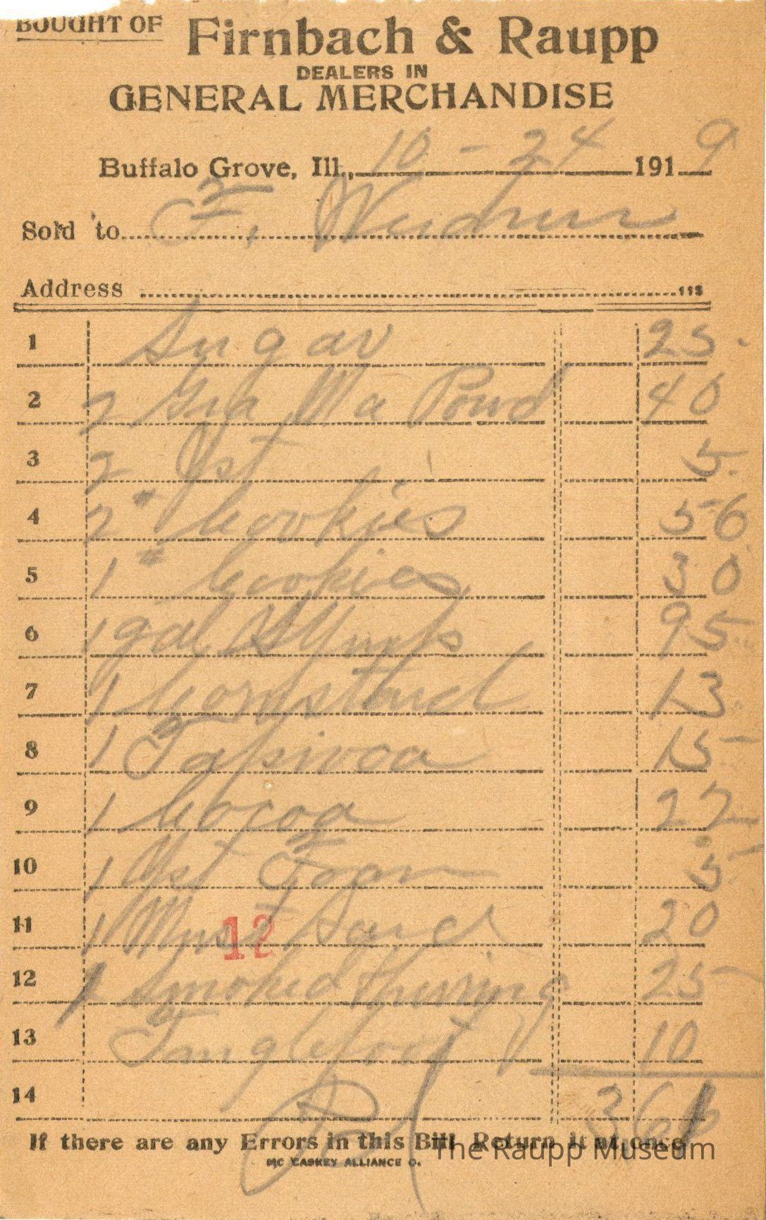The black text is as follows, from top to bottom: Bought of Firnbach & Raupp; Dealers in GENERAL MECHANDISE; Buffalo Grove, Ill.; Sold to; Address; if there are any Errors in this Bill Return it at once.; MC CASKEY ALLIANCE O.Archive Details
