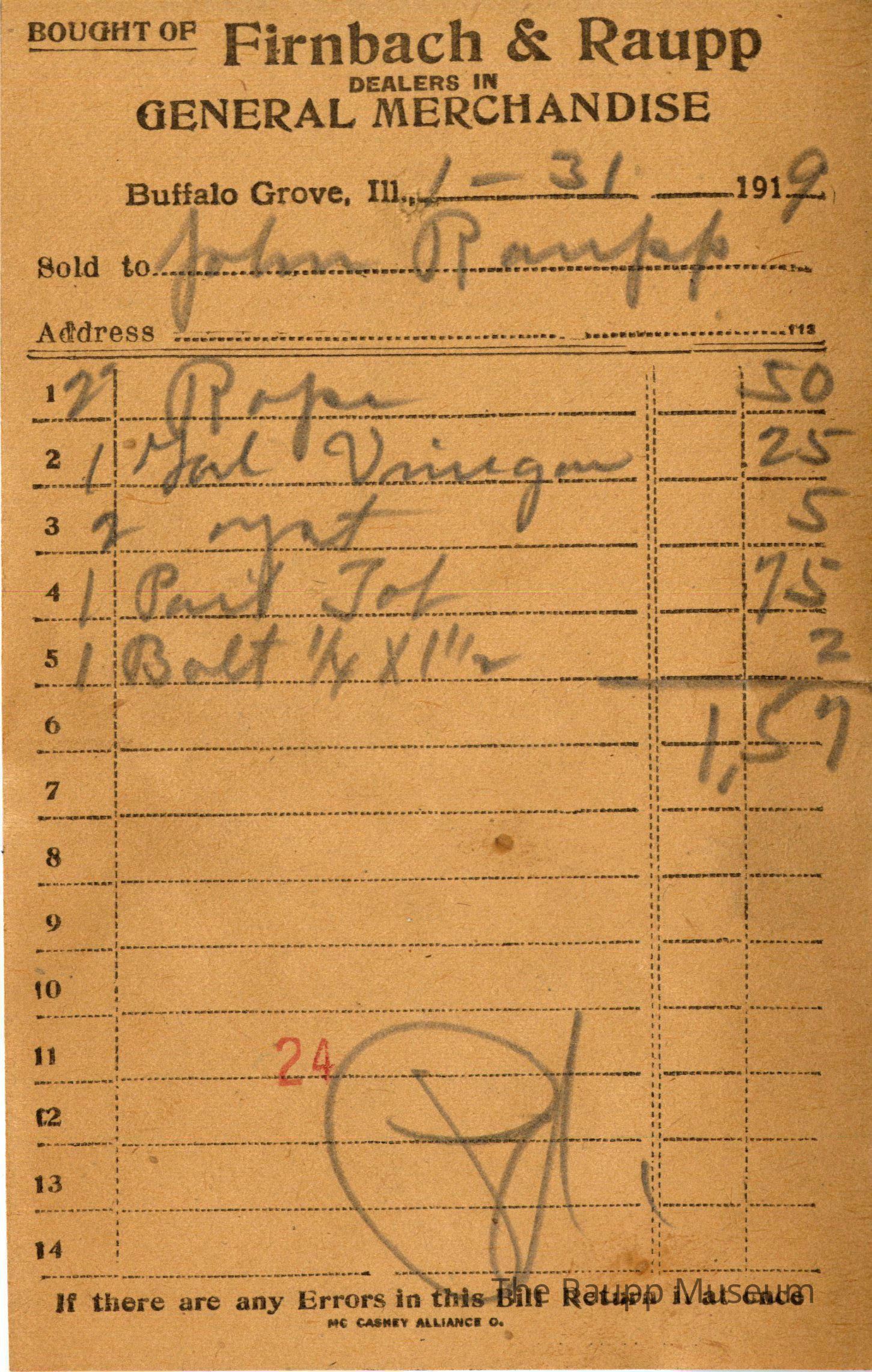 One (1) Firnbach and Raupp store receipt from January 31st ,1919. Receipt is rectangular with black printed text and handwritten notes in pencil. Receipt is for Mr. John Raupp who bought 2 pounds of Rope for $0.50, 1 Gal Vinegar for $0.25, 2 pounds of yeast for $0.05, 1 past (?)tab for $0.75 , 1 bolt 1/4X1.5 in for $0.02. The bill total was $1.57. They paid $1.57 by cash. The bill was marked as paid. There is is a red stamp with the number "24".