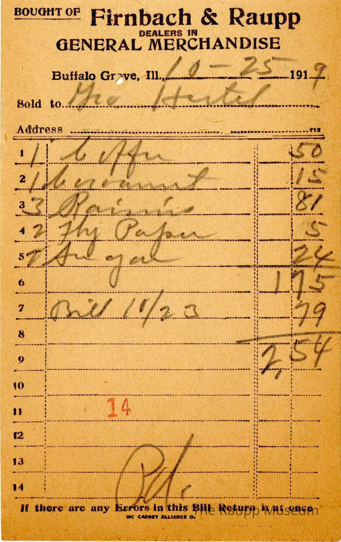 One (1) Firnbach and Raupp store receipt from October 25, 1919. Receipt is rectangular with black printed text and written notes in pencil. The receipt is for Geo Hertel, who bought, 1 Coffee for $0.50, 1 Coconut for $0.15, 3 Raisins for $0.81, 2 Fly Paper for $0.05, 2 pounds of sugar for $0.24, Bill for 10/23 for $0.79 . The bill total was $2.54. There's a red stamp of an 14 close to the bottom, with the bill marked as paid.