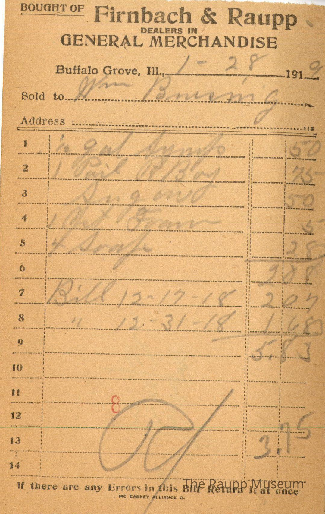 The black text is as follows, from top to bottom: Bought of Firnbach & Raupp; Dealers in GENERAL MECHANDISE; Buffalo Grove, Ill.; Sold to; Address; if there are any Errors in this Bill Return it at once.; MC CASKEY ALLIANCE O.Archive Details