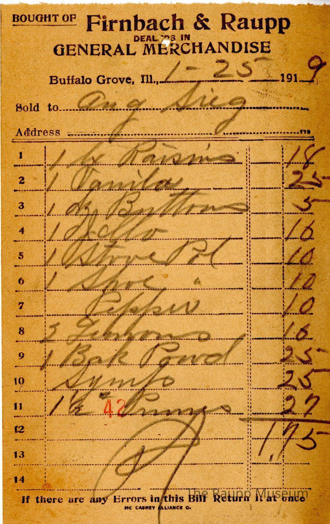 One (1) Firnbach and Raupp store receipt from January 25th,1919. Receipt is rectangular with black printed text and handwritten notes in pencil. Receipt is for August Sieg who bought 1 pack of raisins for $0.18, 1 bottle of Vanilla for $0.25, 1 dozen of buttons for $0.05, 1 jello for $0.10, 1 stove polish for $0.10, 1 shoe for $0.10, peppers for $0.10, 2 lemons for $0.10, 1 Baking Powder for $0.25, syrup for $0.25, 1 1/2 pounds of prunes for $0.27. The bill total was $1.75. They paid $1.75 by cash. The bill was marked as paid. There is a red stamp of "42" close to the bottom.