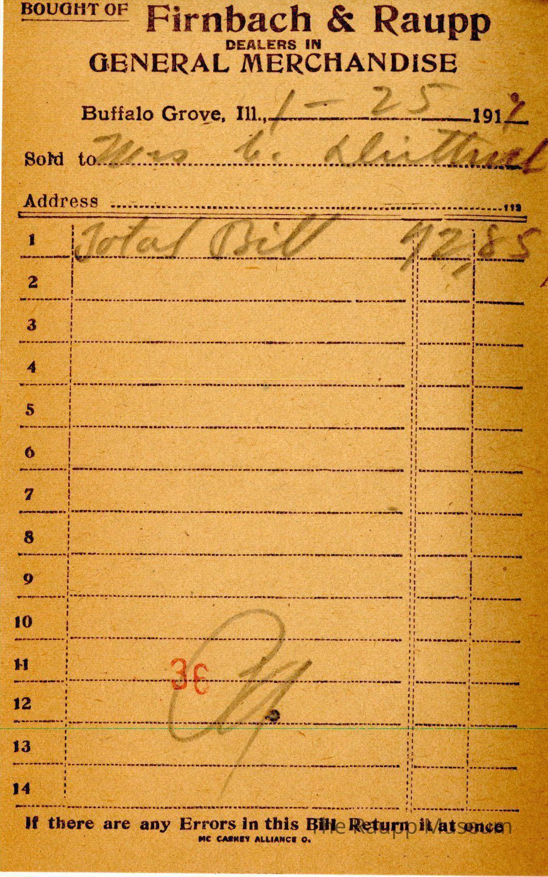 The black text is as follows, from top to bottom: "Bought of Firnbach & Raupp; DEALERS IN GENERAL MERCHANDISE; Buffalo Grove,Ill; Sold to: Address; If there are any errors in this Bill Return it at once: MC Caskey Alliance O."Archive Details