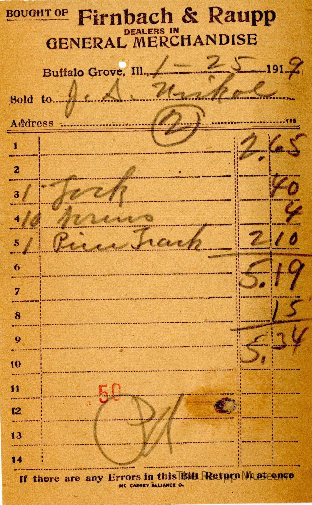 The black text is as follows, from top to bottom: "Bought of Firnbach & Raupp; DEALERS IN GENERAL MERCHANDISE; Buffalo Grove,Ill; Sold to: Address; If there are any errors in this Bill Return it at once: MC Caskey Alliance O."Archive Details