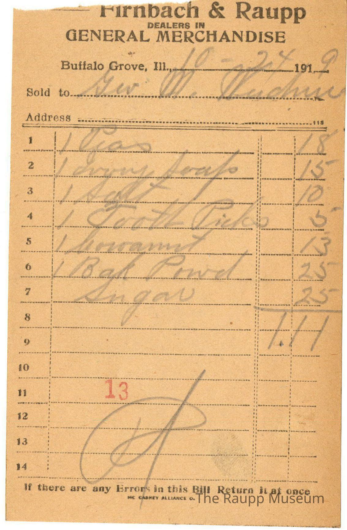 The black text is as follows, from top to bottom: Bought of Firnbach & Raupp; Dealers in GENERAL MECHANDISE; Buffalo Grove, Ill.; Sold to; Address; if there are any Errors in this Bill Return it at once.; MC CASKEY ALLIANCE O.Archive Details