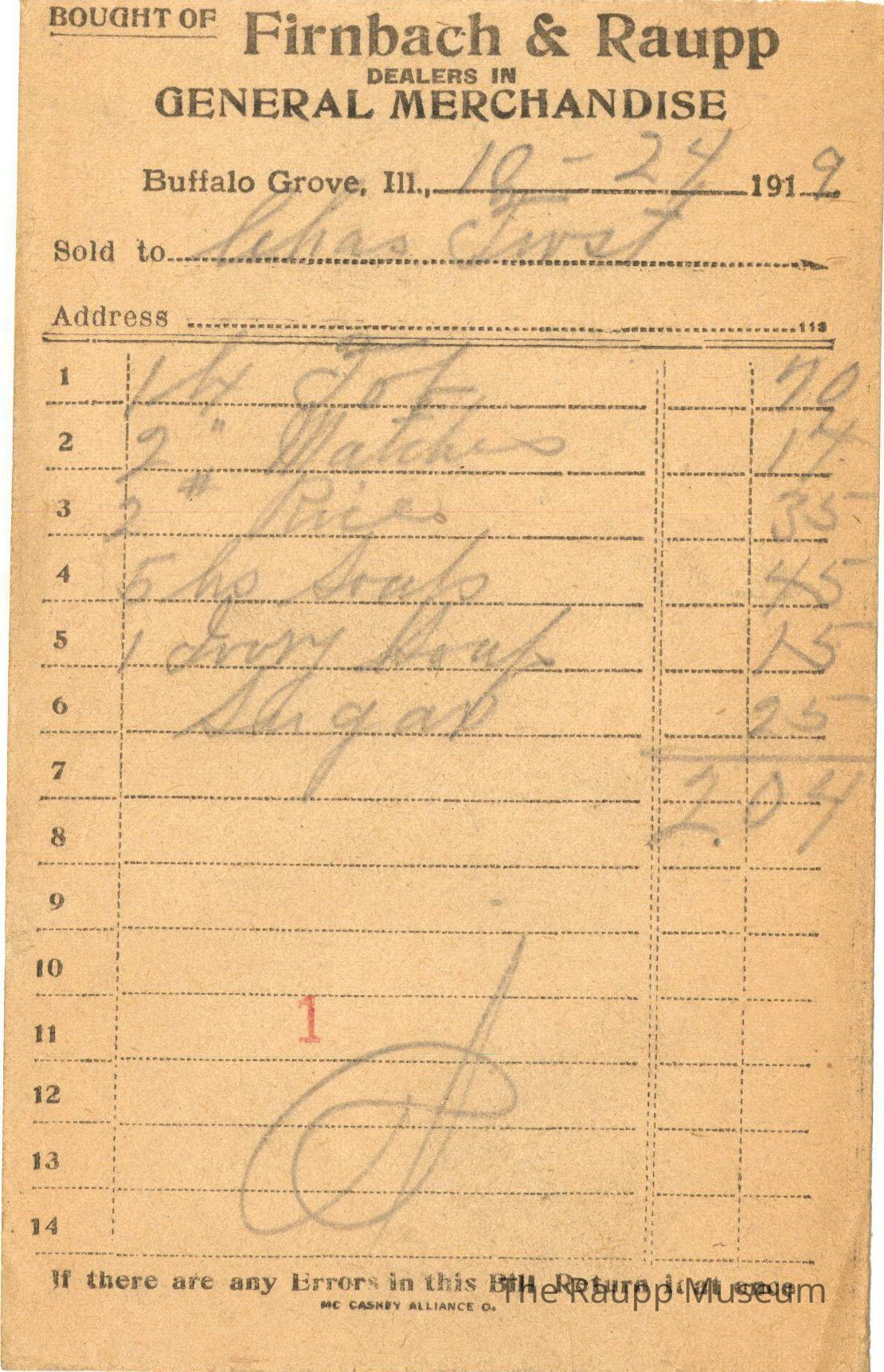 The black text is as follows, from top to bottom: Bought of Firnbach & Raupp; Dealers in GENERAL MECHANDISE; Buffalo Grove, Ill.; Sold to; Address; if there are any Errors in this Bill Return it at once.; MC CASKEY ALLIANCE O.Archive Details