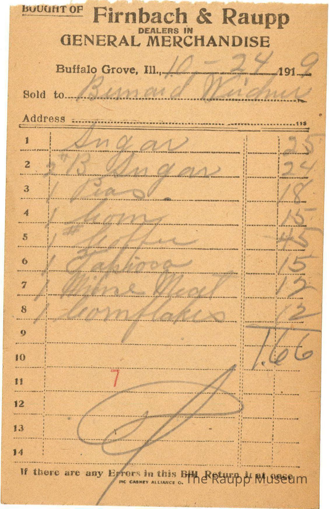 The black text is as follows, from top to bottom: Bought of Firnbach & Raupp; Dealers in GENERAL MECHANDISE; Buffalo Grove, Ill.; Sold to; Address; if there are any Errors in this Bill Return it at once.; MC CASKEY ALLIANCE O.Archive Details