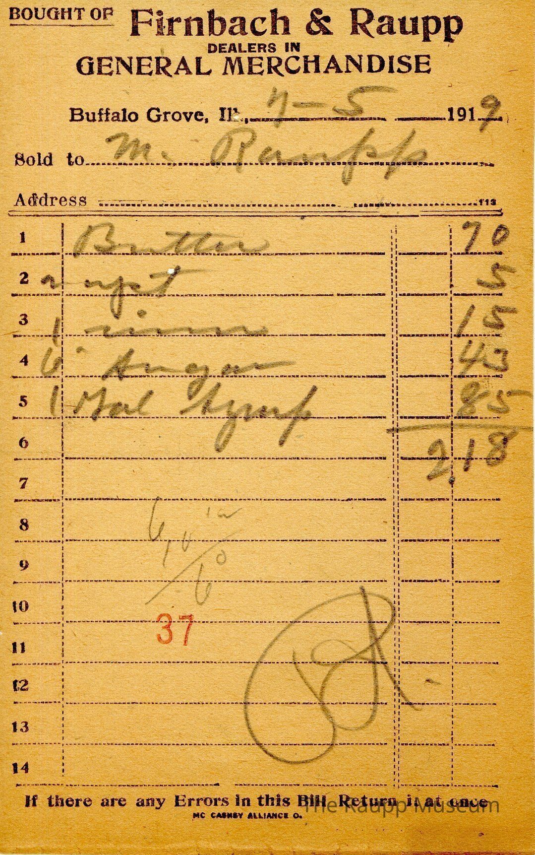 The black text is as follows, from top to bottom bought of Firnback & Raupp; Dealers in General Merchandise; Buffalo Grove, Ill.; Sold to; Address; If there are any Errors in this Bill Return it at once; MC CASKEY ALLIANCE O.Archive Details