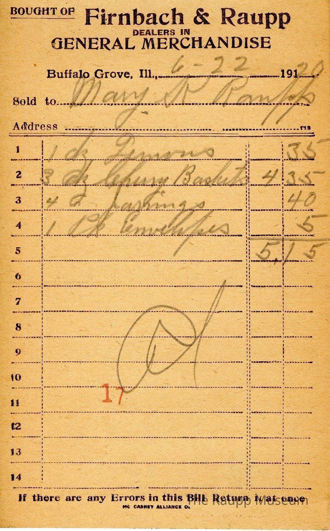 The black text is as follows, from top to bottom bought of Firnback & Raupp; Dealers in General Merchandise; Buffalo Grove, Ill.; Sold to; Address; If there are any Errors in this Bill Return it at once; MC CASKEY ALLIANCE O.Archive Details